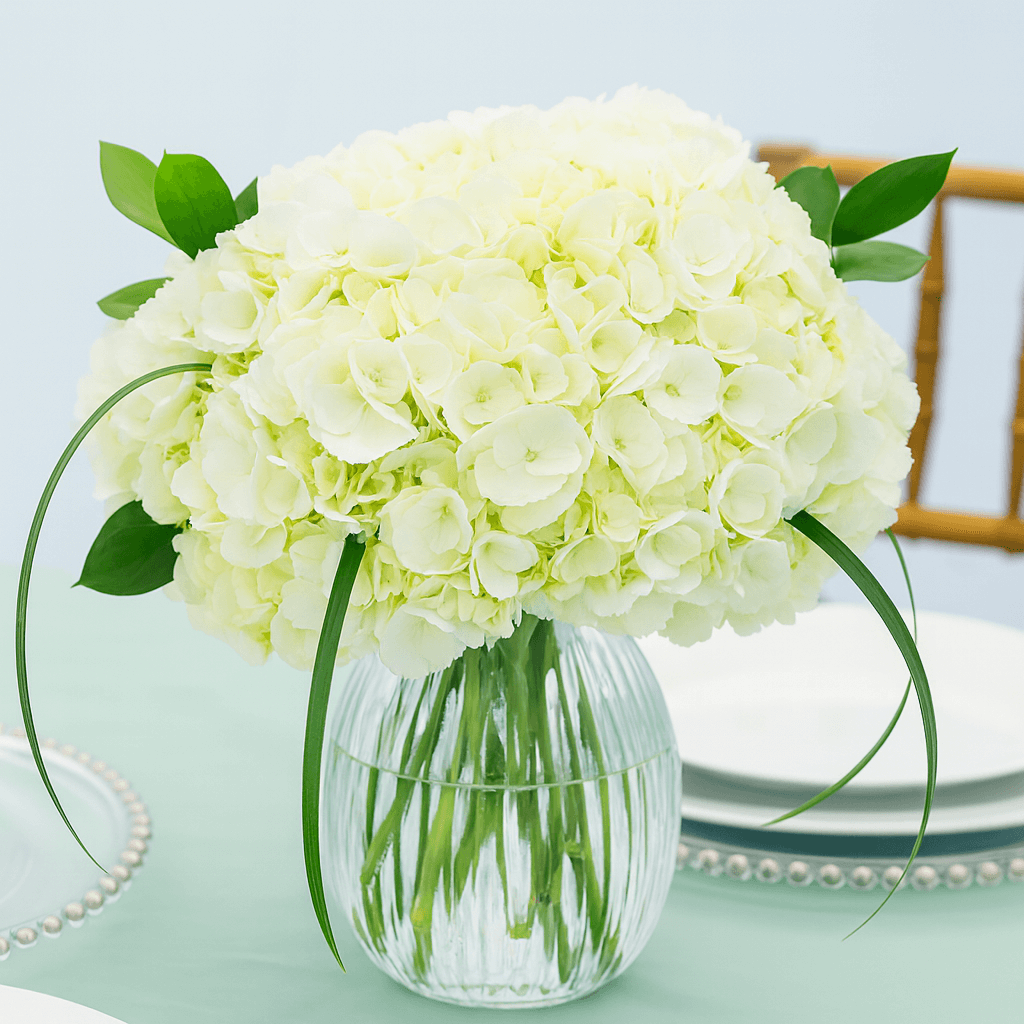 A simple beauty of elegance in these white centerpieces. Three hydrangea centerpieces per box. The centerpiece has 5 hydrangeas, 4 ruscus, and 5 lily grass. It is 16" to 18" tall. Vases are not included. Most centerpieces should use a vase that measures 5" to 9" inches in height with an opening of 3" to 5" inches wide. You may adjust the distance across the flowers by tying the bouquet in the center or allowing it to stand on its own in the vase depending on the look you want. In all wedding/or special occasion flowers we recommend your delivery date to be two or three days before your event and to order at least 10 days before the delivery date. Your wedding flowers and wedding roses are shipped absolutely fresh, direct from the greenhouses to you via FedEx. Globalrose sells wholesale flowers and wholesale roses at prices that are usually lower than most local wholesalers. All our wedding flowers and wedding roses are cut specially for you and your special event, 3 days before they are delivered to your door. Color tones for all flowers and roses may vary due to the computer monitor and/or Mother Nature.