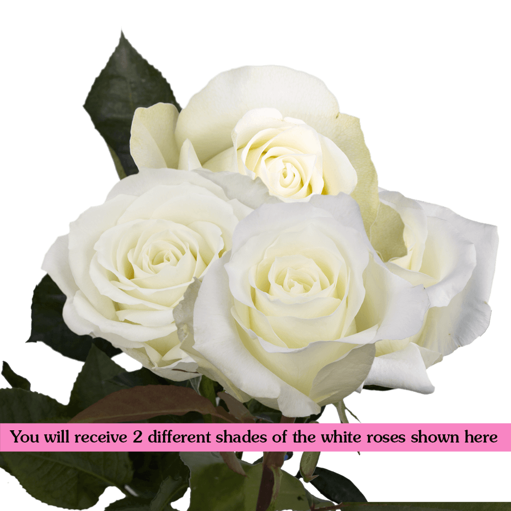 Bring refined beauty and subtle dimension to any space with 50 assorted white roses, featuring a delicate mix of white, ivory, cream, and soft pearl tones. Each bloom is carefully selected for quality and variety, making this collection perfect for weddings, special events, or elegant gifts. These fresh-cut white roses measure approximately 17 inches in length, with lush blooms up to 4 inches in diameter. Shipped directly from our farms via FedEx or UPS, they arrive fresh and ready to impress. Ideal for DIY arrangements, florists, or event planners, this box of bulk assorted white roses offers the elegance of white blooms with added depth and variation�at nearly half the cost of traditional florists. Whether you're decorating for a celebration or sending a timeless gift, these wholesale roses are a sophisticated and versatile choice.