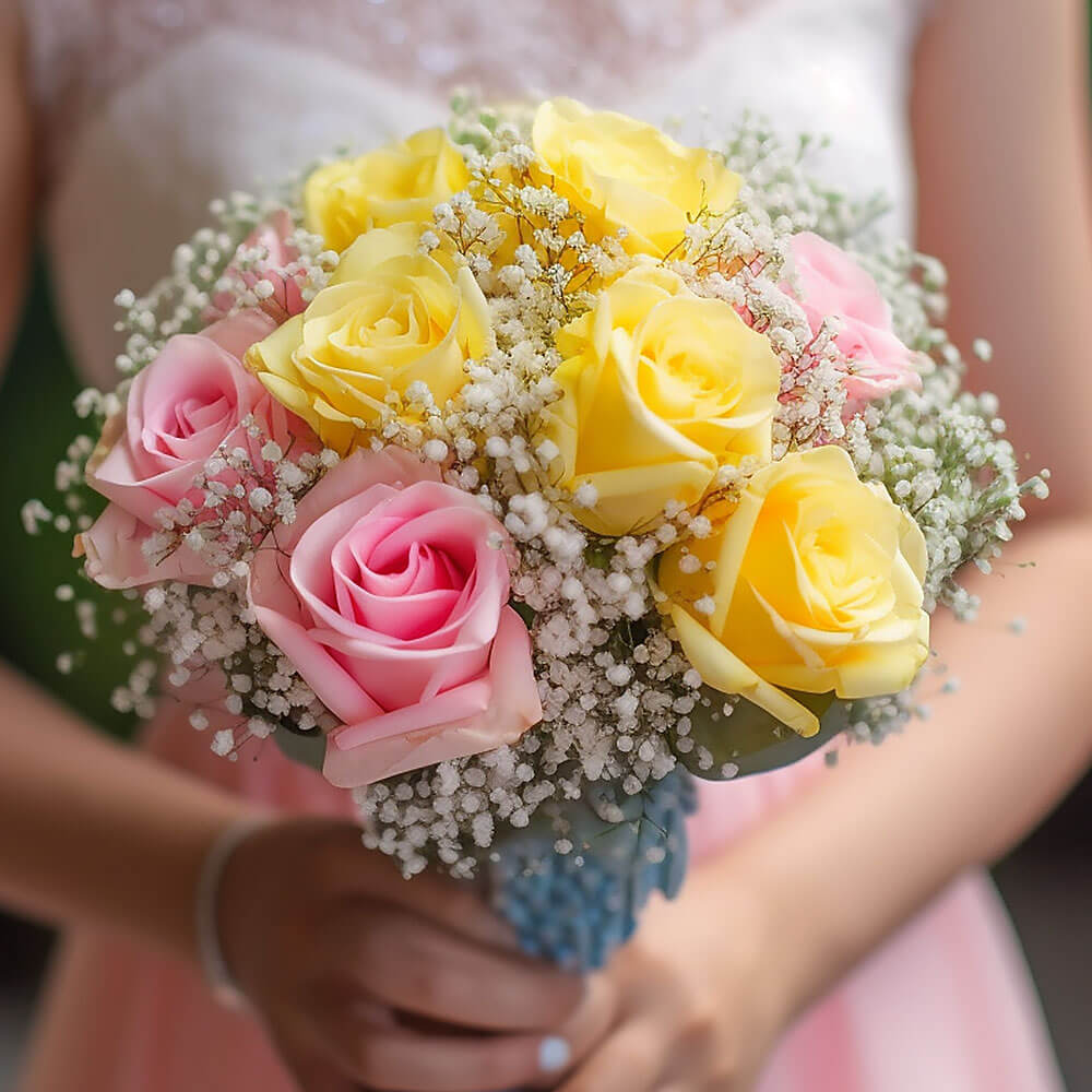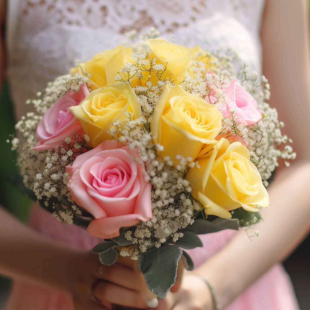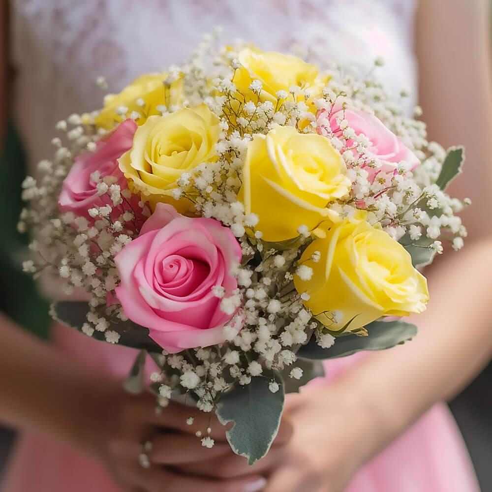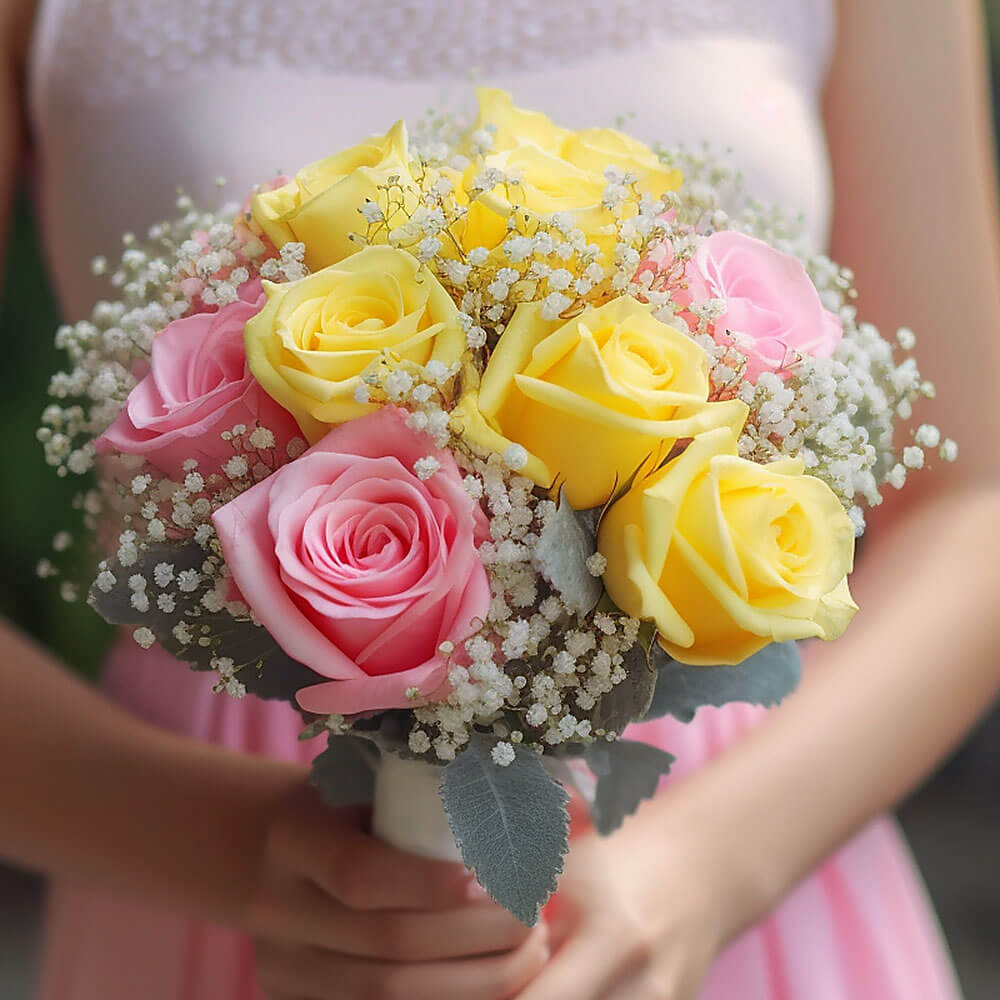 Buy yellow and pink rose bridesmaids bouquets online for your beloved girl pals to accompany you on your wedding day. No matter your wedding theme from romantic spring evenings, bohemian nights to vintage receptions, you can easily match these rose bridesmaids bouquets to your color palette. The lovely warm yellow and pink accents will be complemented beautifully by fluffy little white gypsos.