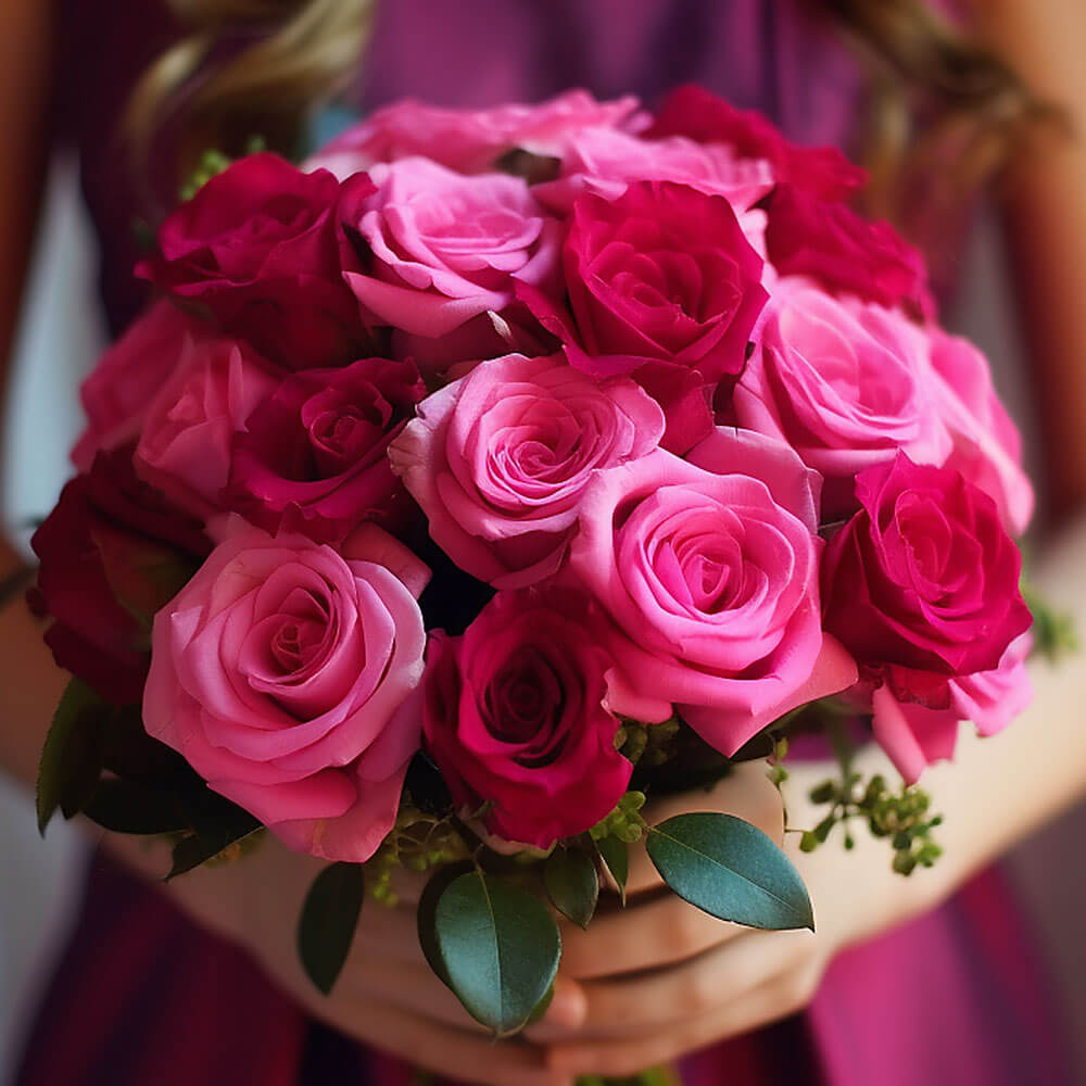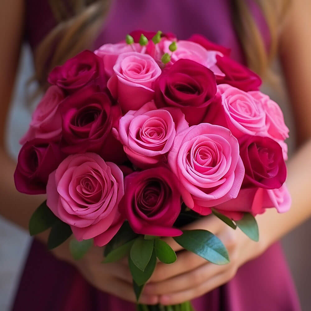 The bright, warm tones of these roses will scream elegant romance and add just the right amount of color to your overall bridal look. Buy dark pink & light pink rose bridesmaids bouquets from our online store and you will be receiving garden-fresh flowers straight from the source. We grow all these stems in specialty greenhouses and our in-house team of florists will hand craft each bouquet for your girl squad. Your floral package will arrive with beautiful semi-open roses sitting atop dark green stems that are 16 to 18 inches long.