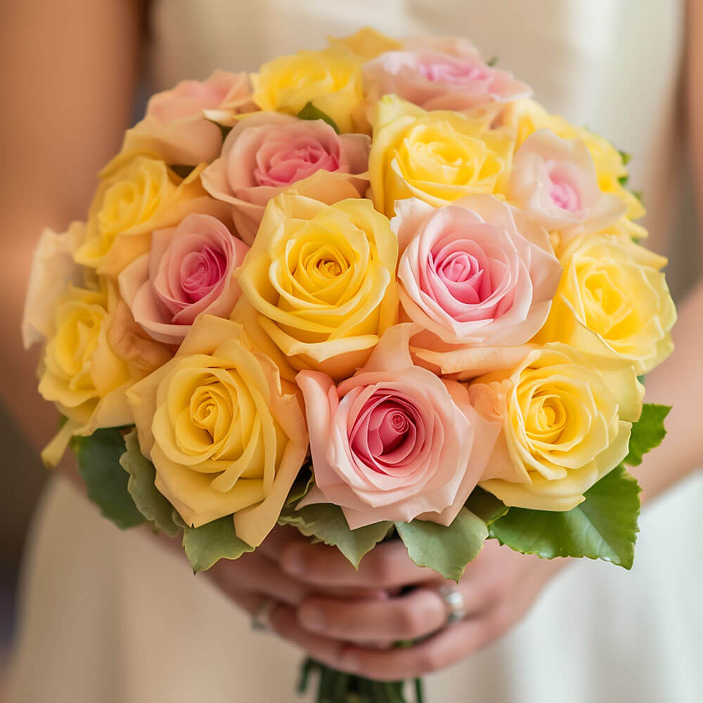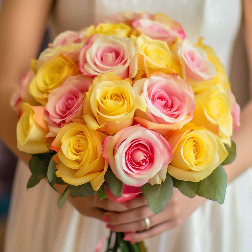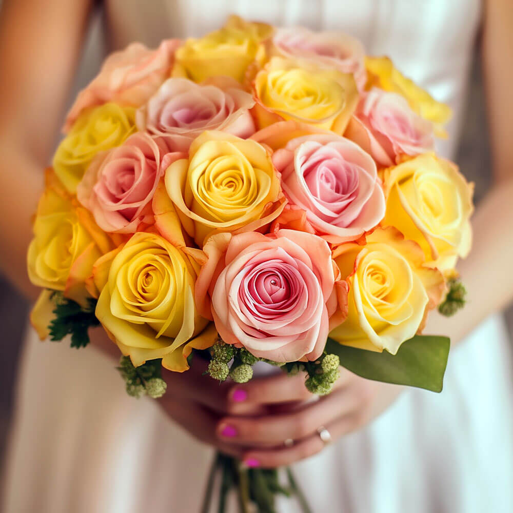 Our fresh beautiful pink & yellow rose bridesmaids bouquets can be used for a variety of wedding styles from romantic garden ceremonies to warm summer night celebrations. The bride's favorite squad will not only look absolutely lovely holding these yellow and pink roses but they will easily add a little splash of fun to your big day. Every single bridesmaids bouquet in this order will contain 28 stalks of roses and greens each. Order from us and receive hand crafted bouquets shipped directly to your chosen location absolutely fresh, with every bloom intact.