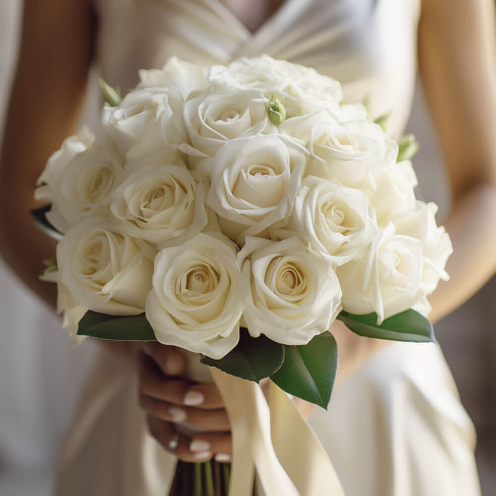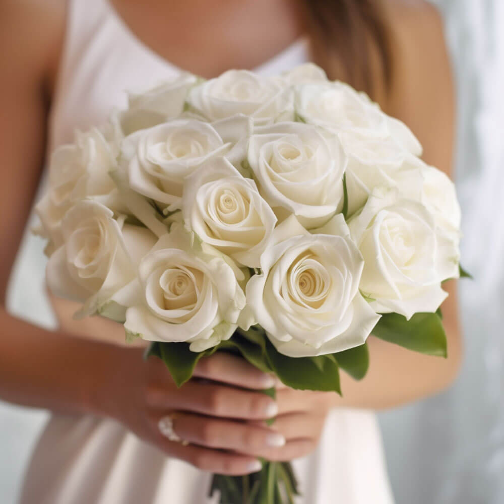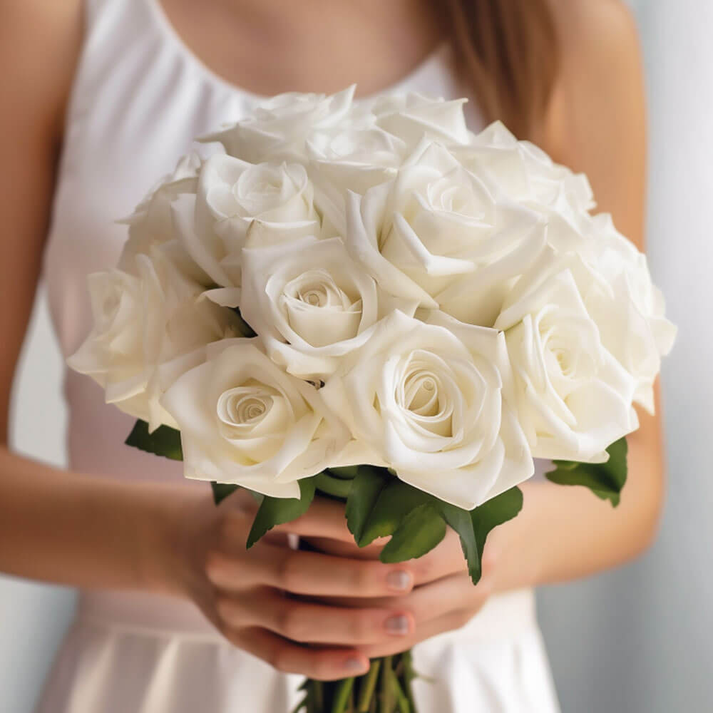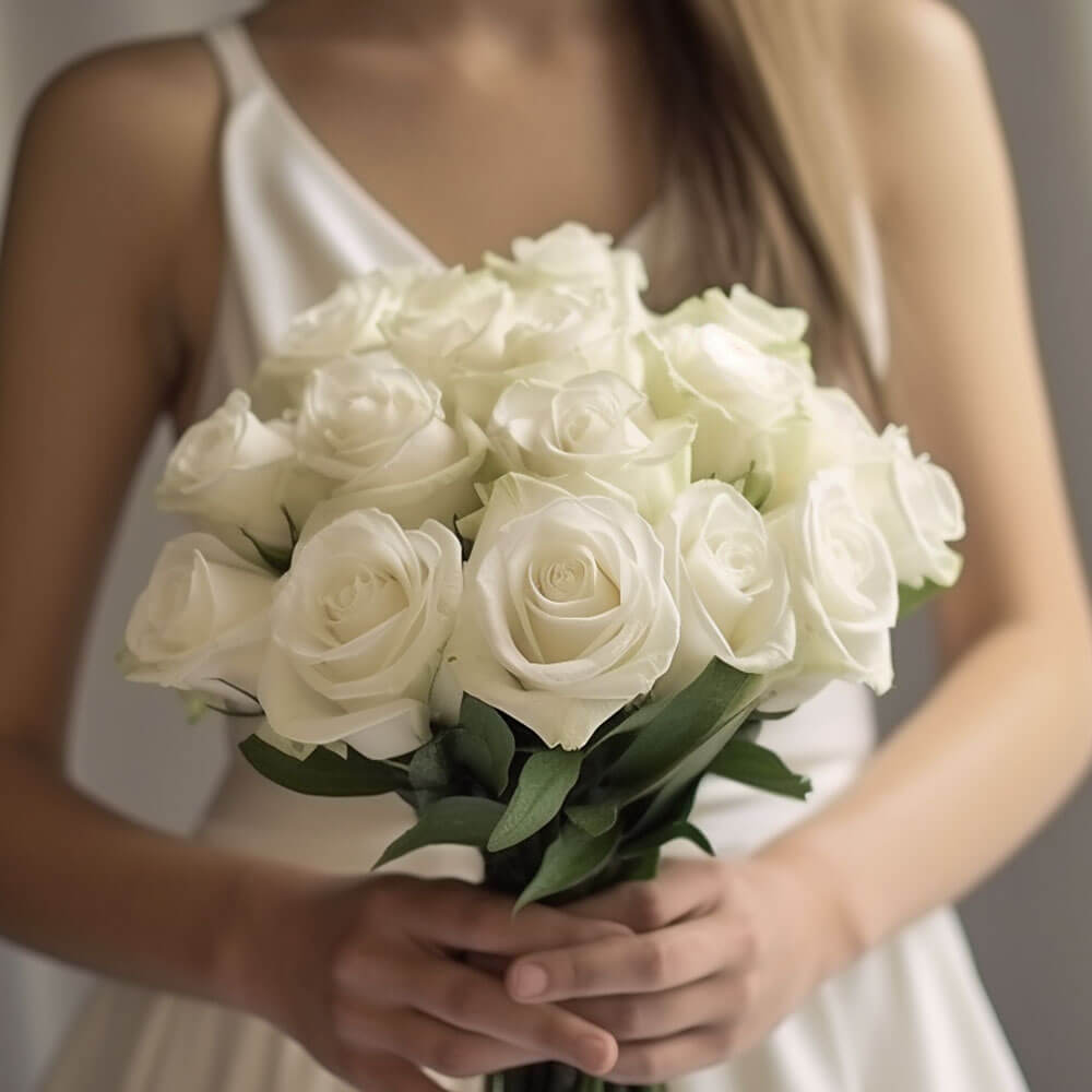 Each one of our beautiful white rose bridesmaids bouquets contains 28 stems of fresh flowers and greens. They are incredibly versatile to suit all kinds of events so do consider them for lovely wedding receptions, both indoor and outdoor celebrations and more. This handheld round bouquet will be prepared right here in our greenhouses and shipped to you within 3 short days. That's right, you will be receiving farm-fresh flowers directly from the growers at such a low price point without leaving your home.