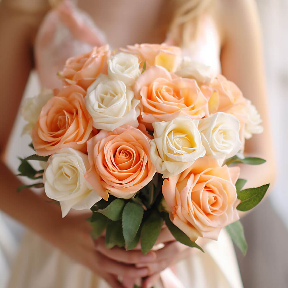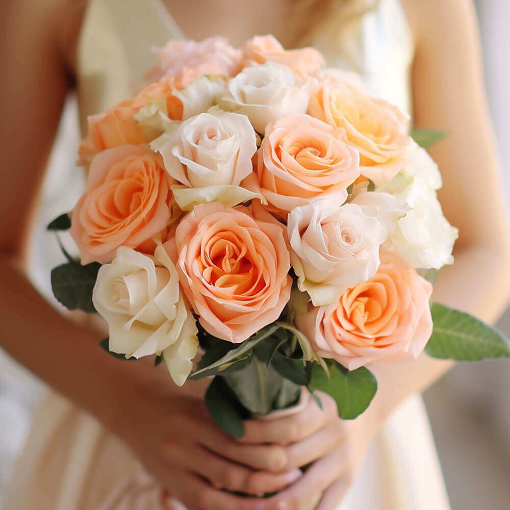 Every single stem in our online best peach and white rose bridesmaid bouquets will be carefully selected to ensure top quality before they are snipped by hand and packaged for delivery. Our in-house florists will ensure that each arrangement is prepared just for you 3 days before they arrive at your doorstep or the location of your choice. Thanks to our free delivery service, you will be receiving even greater value for money and save a ton on your wedding florals. Just browse our site to discover more selections of colorful roses, showy lilies, fluffy carnations and more to help turn your wedding into a fairytale event.