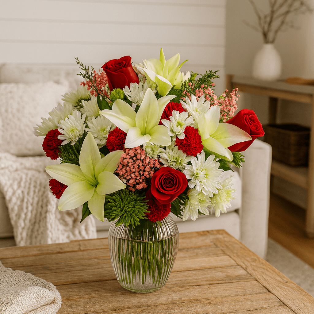 Your floral package will be shipped fresh from our facilities with each arrangement containing 1 white Asiatic Lily, 2 red Matsumoto stems, 2 Babys Breath stems, 5 green and 4 white Novelty Pom stems and 3 red roses. Our gorgeous glowly white blooms will be contrasted beautifully by the bright red and festive-looking flowers. These cheerful bouquets can be used for a variety of occasions from Christmas, Thanksgiving, birthdays and more.