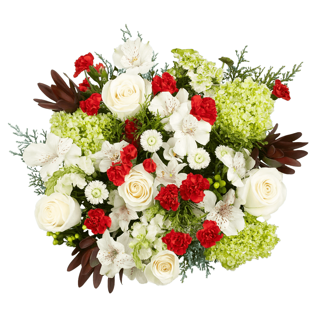 Here’s an easy way to give a rustic, yet modern look to your home this Christmas season. Next to the silver bells or glitter gold decorations, consider adding some fresh flower bouquets with hues of white, red and green. We have a beautiful flower bouquet for Christmas, hand made using 40 fresh stems; 4 red Spray Roses, 5 ivory Roses, 3 white Alstroemerias, 5 white Button Poms, 4 red Mini Carnations, 3 green Mini Hydrangeas, 5 white Snapdragons, 3 green Hypericums, 3 green Safari Sunsets and 5 green Pines. Now you can get two complete bouquets for the low price of one. Say Merry Christmas this year with one beautiful flower bouquet for Christmas for your home and another for mom's. She will surely fall in love with the festive combination of red spray roses and mini carnations nestled amongst ivory roses and mini hydrangeas as families come together to celebrate this joyous season. Please note that this order does not include flower vases or containers of any kind. To add one to your order, simply browse through our site for one that suits you. When you shop online, know that your flower bouquets will be shipped absolutely fresh, direct from our greenhouses to you via our trusted delivery partners, UPS or FedEx.