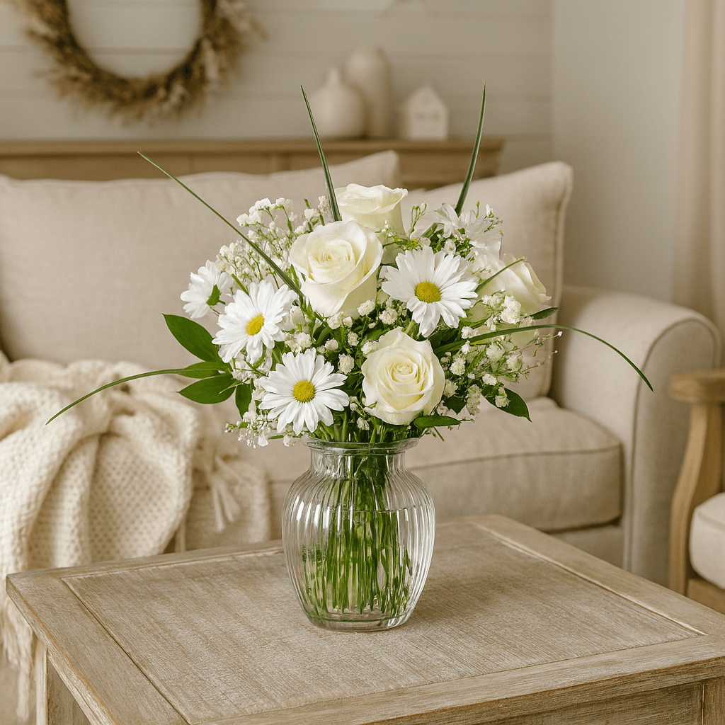 Place this order to receive our customized floral box containing 12 marvelous Christmas flower arrangements, made with 19 stems of white flowers and greenery. Each bouquet is put together using 3 stems of white Daisy Poms, 3 stems of green Ruscus leaves, 5 stems of Lily Grass, 2 stems of white Micro Poms, 2 stems of white Alstroemerias, 3 stems of ivory Roses and 1 stem of Babys Breath.