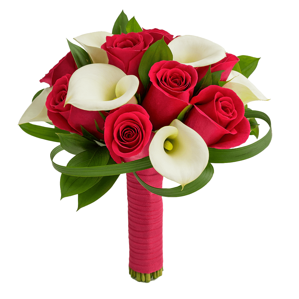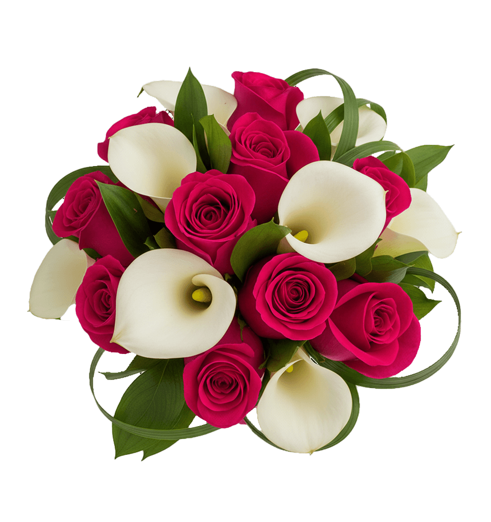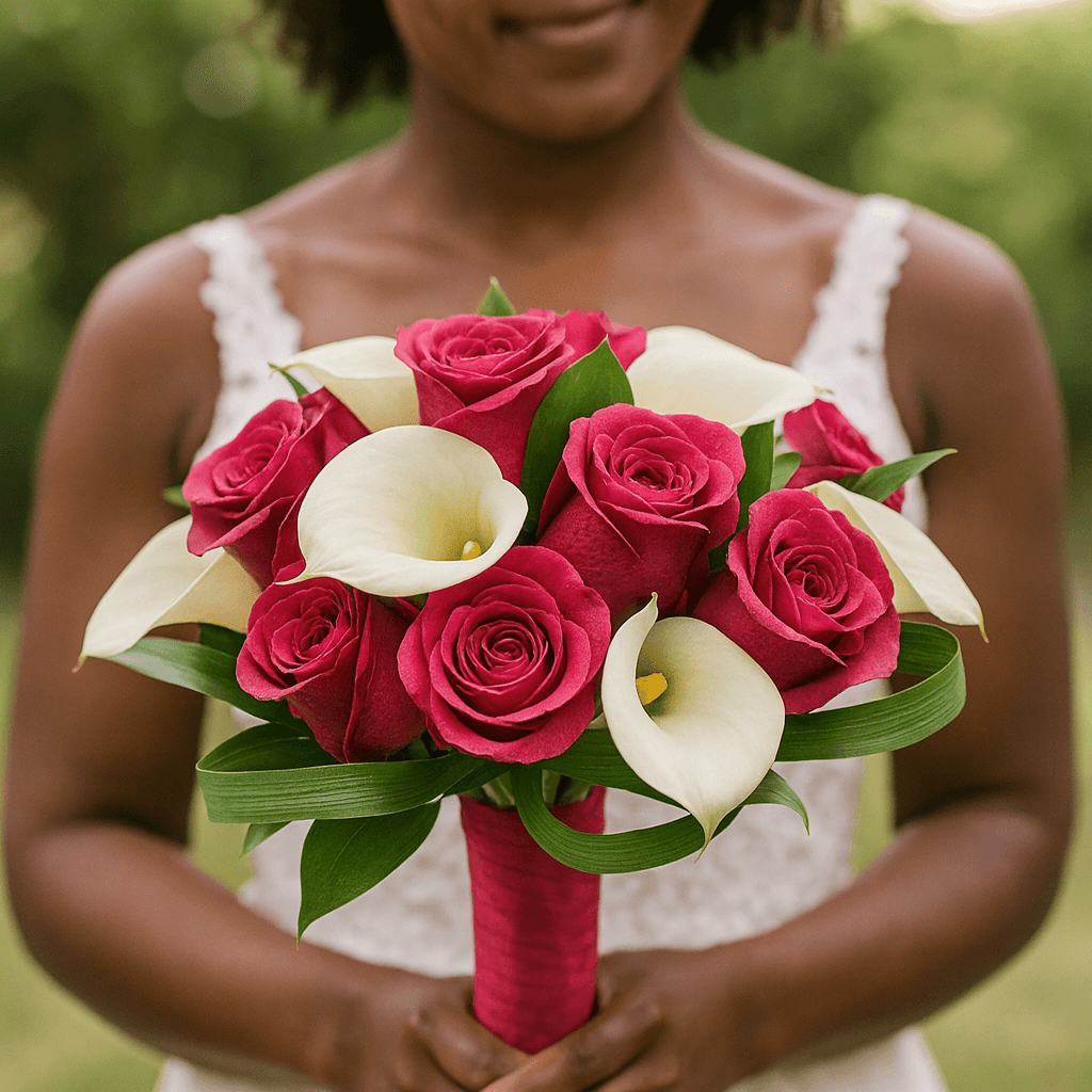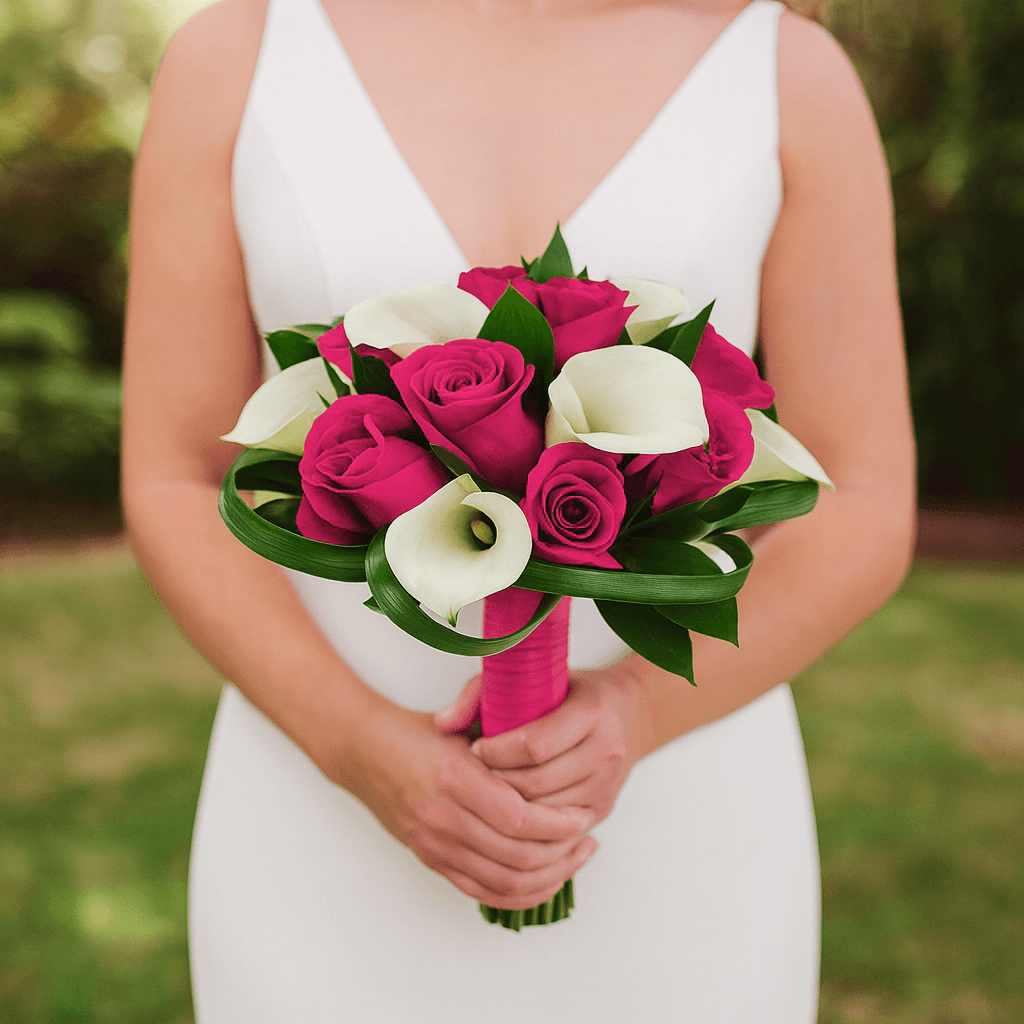 Roses are the ideal match for the more tailored look of calla lilies to create classic bouquets for a variety of events from formal to casual occasions. It's hard not to love our farm fresh bridesmaid bouquet with free delivery included. These stems of white calla lilies and dark pink roses will really lend themselves to that elegant style of design for your wedding day especially when wrapped with the ribbon color of your choice.