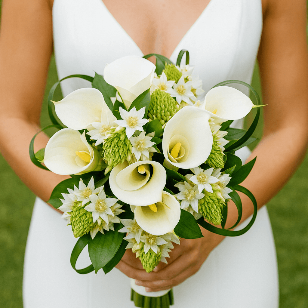 Make your wedding day unforgettable with our Bridal Bouquet featuring Calla Lilies and the Star of Bethlehem. A symbol of purity and elegance, this handcrafted arrangement brings a timeless charm, crafted for the romantic heart. Our flowers of lily, nurtured with love, ensure freshness for your big day.