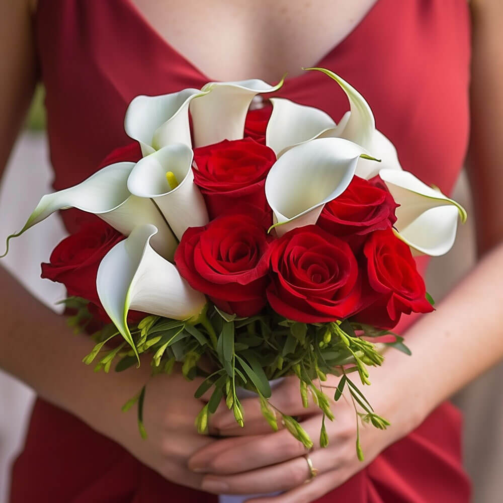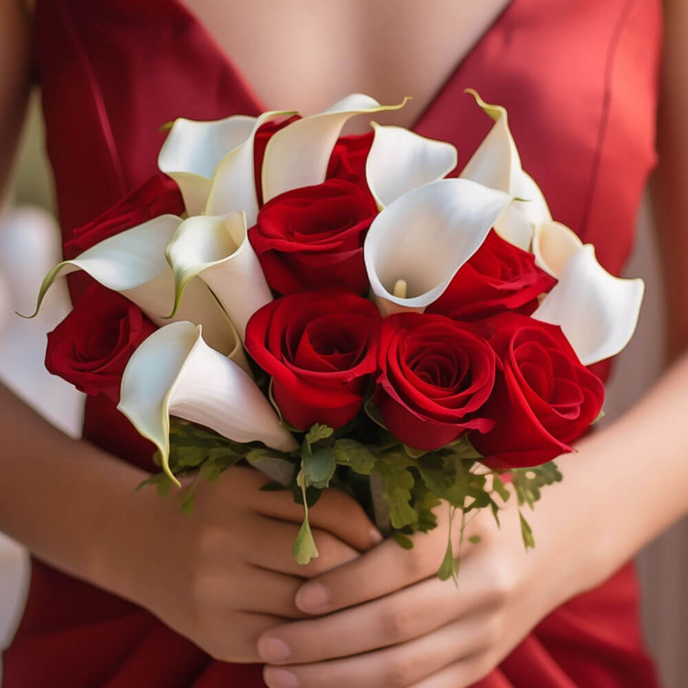 Fresh red roses and calla lilies as bridesmaid bouquets match well like good wine and meat. Much like this, the color red and white bring out the best in each other, although having completely contrasting tones. This combination comes with 19 stems of roses and 7 white calla lilies, giving it a wholesome and plump output, making it an ideal accessory for a trip down the aisle. Lilies can last for longer as compared to the roses, hence making it a good accent for your home after the event.