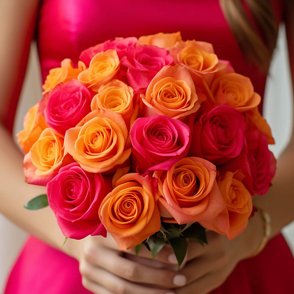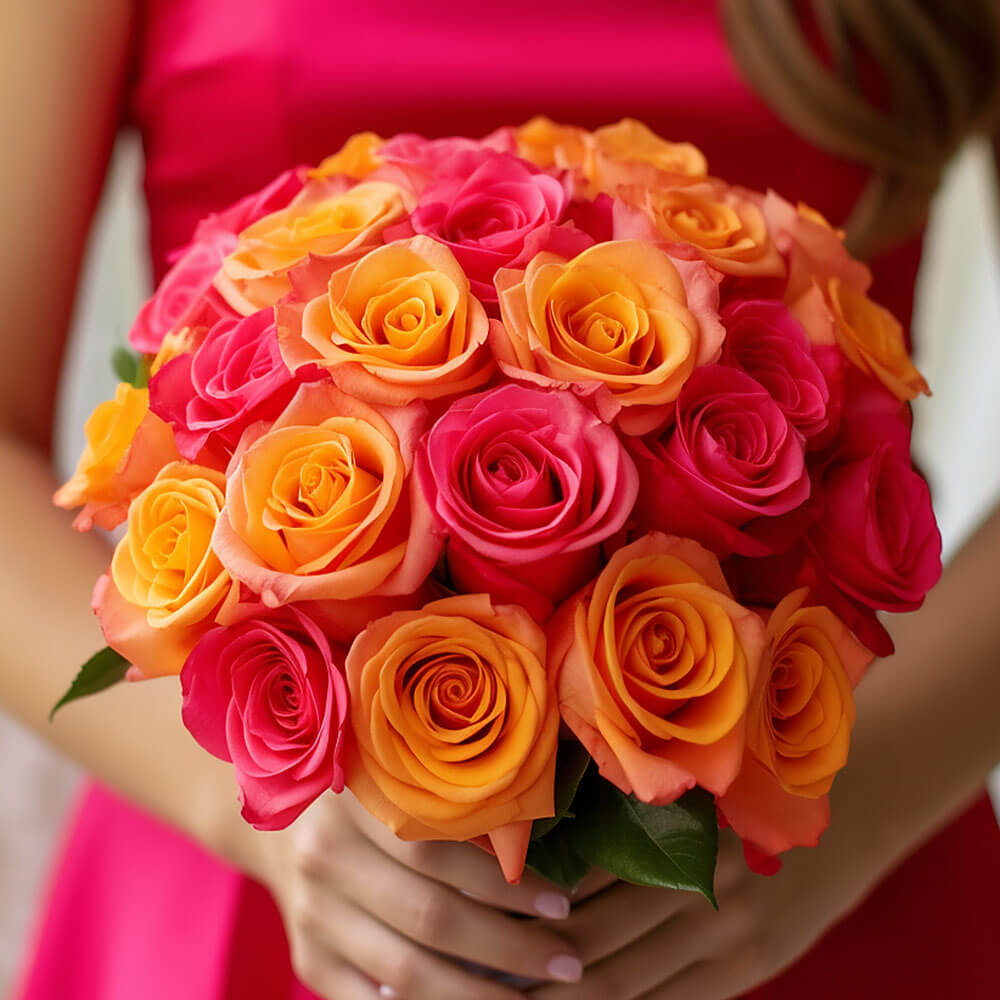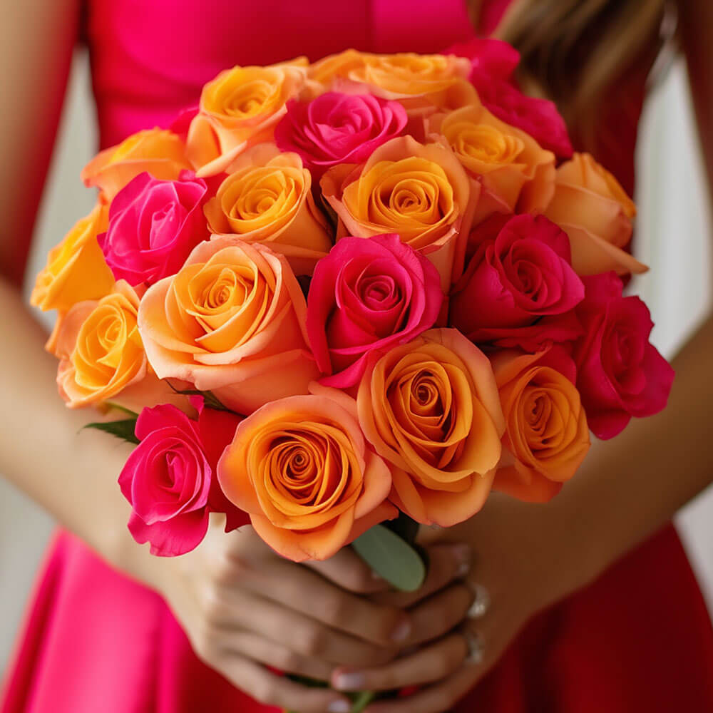 Every little girl dreams of her fairytale wedding to the man of her dreams. She probably has everything thought out, even down to who would be her support on her special day. Picking her bridesmaids is such an important part. Each bridesmaid has played a significant role throughout her life and would want to share this big day with them. We’re sure that she would want them to be just as glamorous as she is and with our collection of royal bridesmaids’ bouquets with dark pink and orange roses, they’d have the bouquet to match.