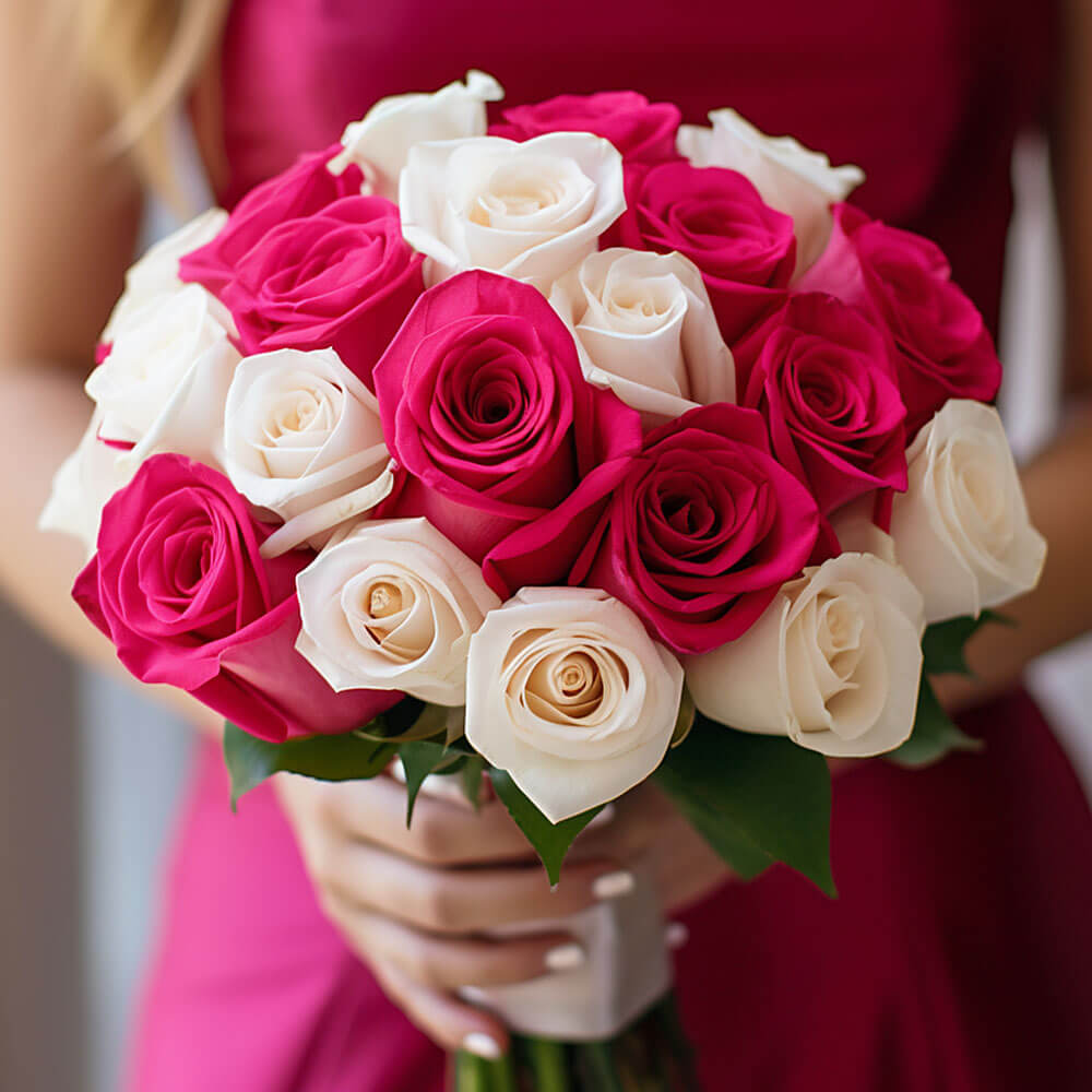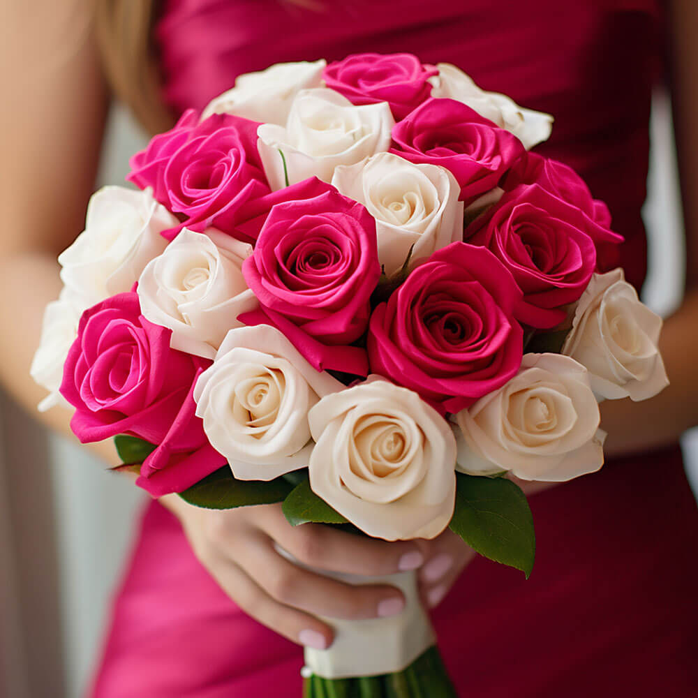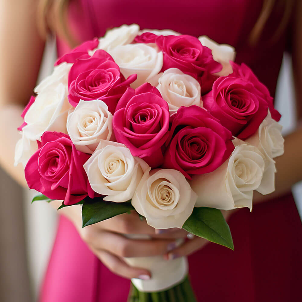 Let your dreams blossom with our gorgeous royal bridesmaids rose bouquets with dark pink and white roses. This seductive yet pure bouquet will definitely be the talk of your occasion whether they be for set as bouquets, centerpieces or even as the accents to the rest of your floral décor. The dark pink color of roses is perfectly contrasted with the white and will add a touch of versatility to proceedings. If you are making a floral decision that is both classic yet elegant, this is definitely the choice you should be making.