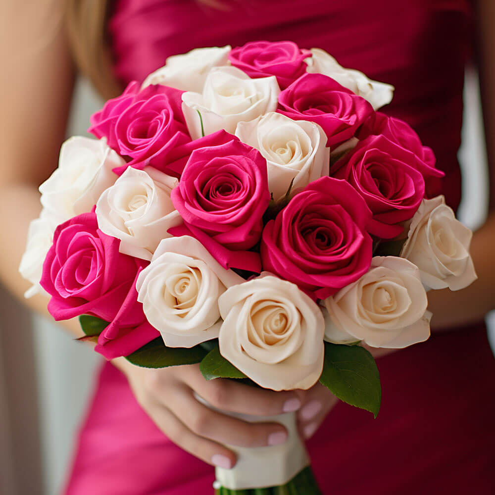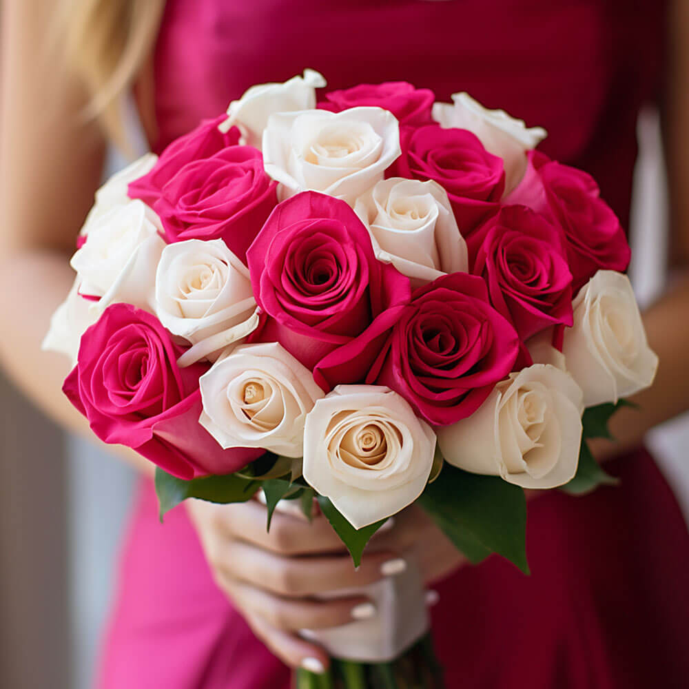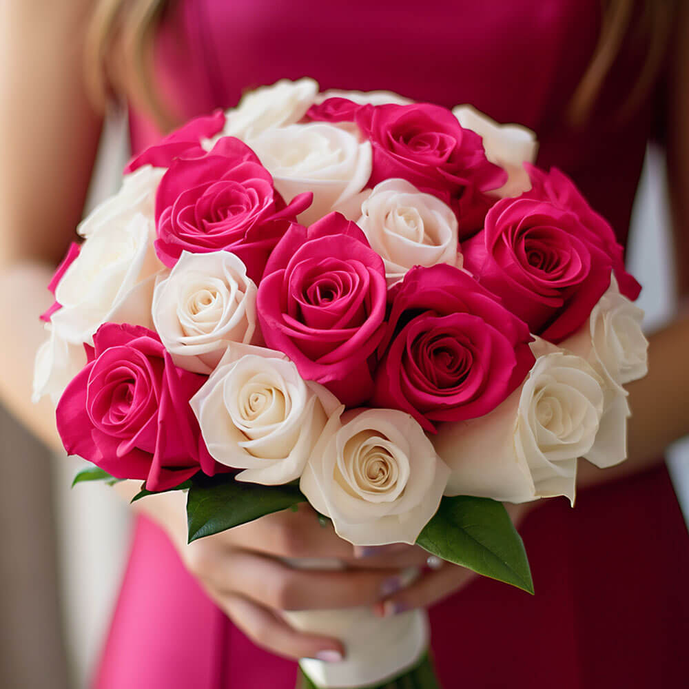 The thought of planning a wedding can be daunting as you would start to micro-manage every last detail you can. Here at GlobalRose, not only do we offer complimentary shipping, we can also help ease that process by offering you a one stop solution for all your floral needs. Be it for centrepieces, wedding party bouquets, arches, church décor and even right down to corsages, we have it all. It is often said that wedding flowers dictate the direction of the mood and feel of an event. Therefore, with the help of this beautiful royal bridesmaid rose bouquet with dark pink and white roses, you can set a high standard for a ravishing reception.