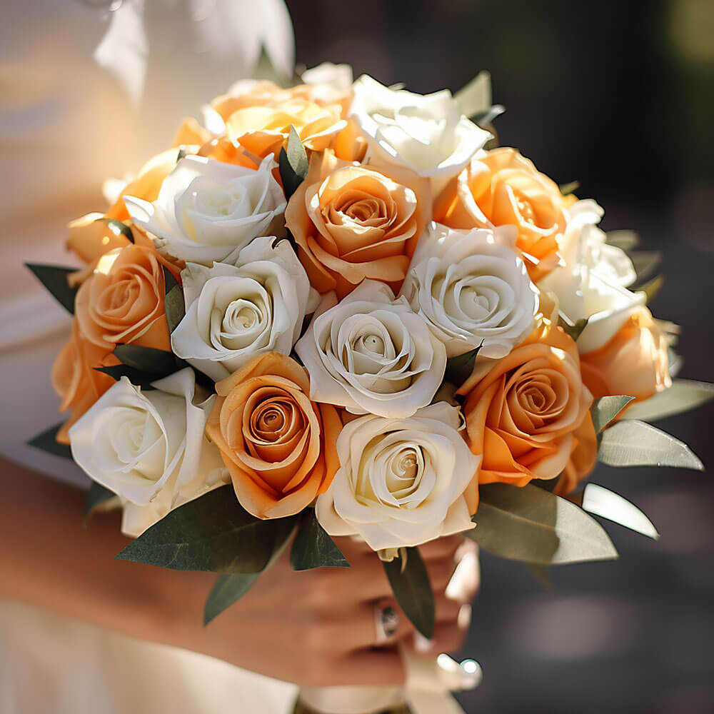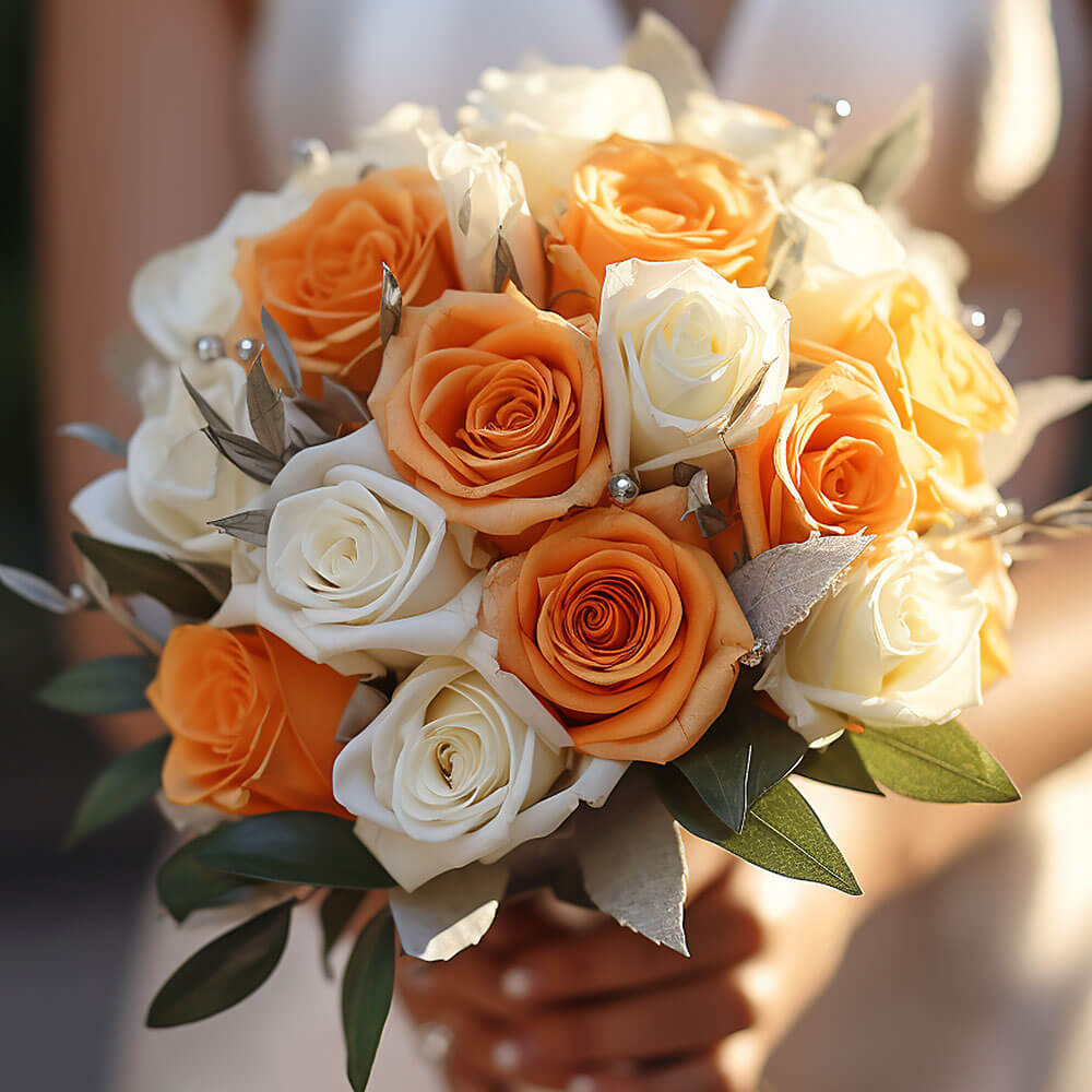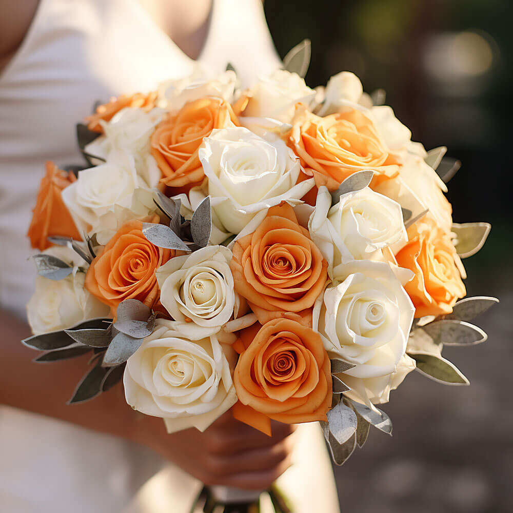 Planning the right time and season for your wedding can sometimes be a stressful experience. Often enough, a fall wedding is one of the best events to plan for because of its down to earth and rustic vibe. Buy our royal bridesmaid rose bouquet with orange and white roses which are a perfect match for your autumn nuptials as they stimulate the blend of fallen leaves and their beautiful colors. The purity of the white tames the fiery and wild nature of the orange.