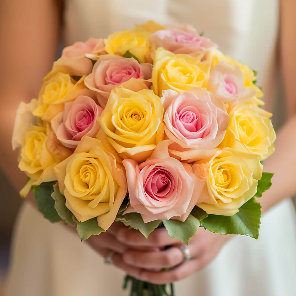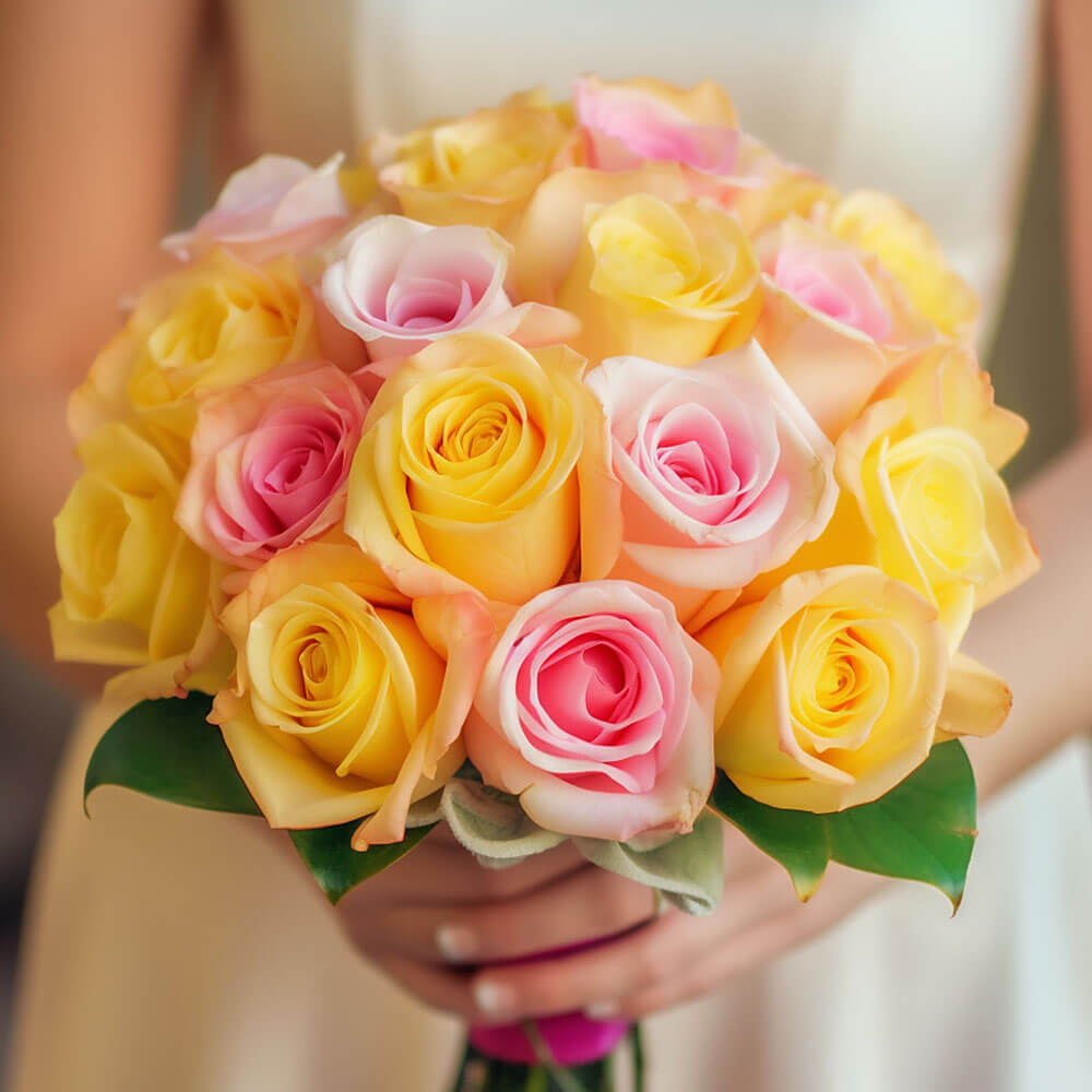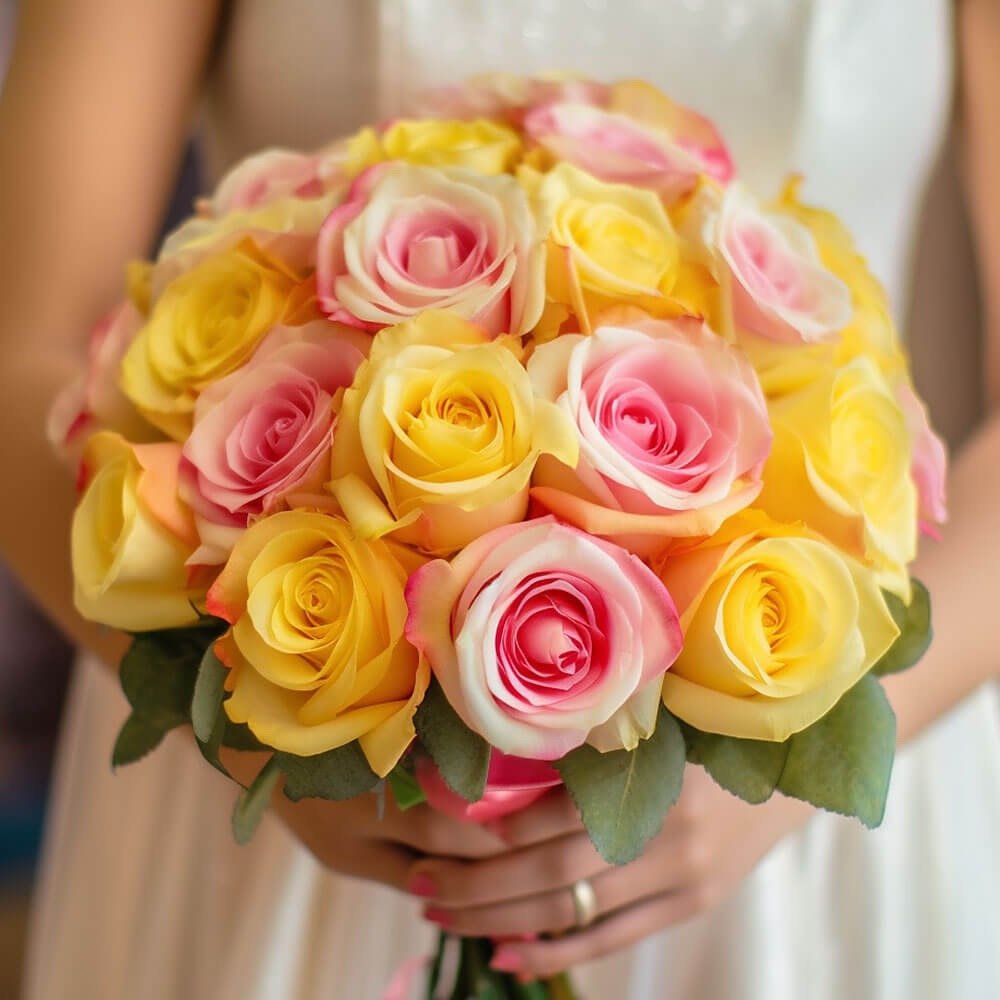 Exude romance and cheekiness with these beautiful romantic bridesmaids rose bouquets with pink and yellow roses. This variety comes accompanied with lily grass that are assembled in a circular motion to give it a soft finish. While roses in general are the international icon for wedding flowers, they do vary in terms of meaning when it is broken down to colors. Yellow and pink collectively mean gratitude and friendship, which makes this a good selection for a congratulatory token or just to brighten up someone’s day.