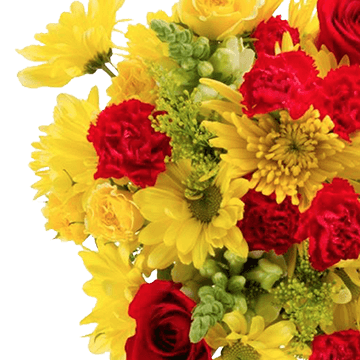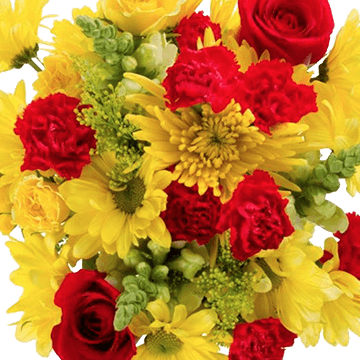 Each bouquet is a fabulous arrangement of 15 flowers. Vase not included. Each box comes with 8 superb bouquets and each arrangement contains 3 stems of Yellow Daisies Pompoms, 3 stems of Red Spray Carnations, 1 stem of Yellow Spider Mum, 2 stems of Red Roses, 3 stems of Yellow Snapdragons, 1 stem of Yellow Spray Rose and 2 stems of Solidago.