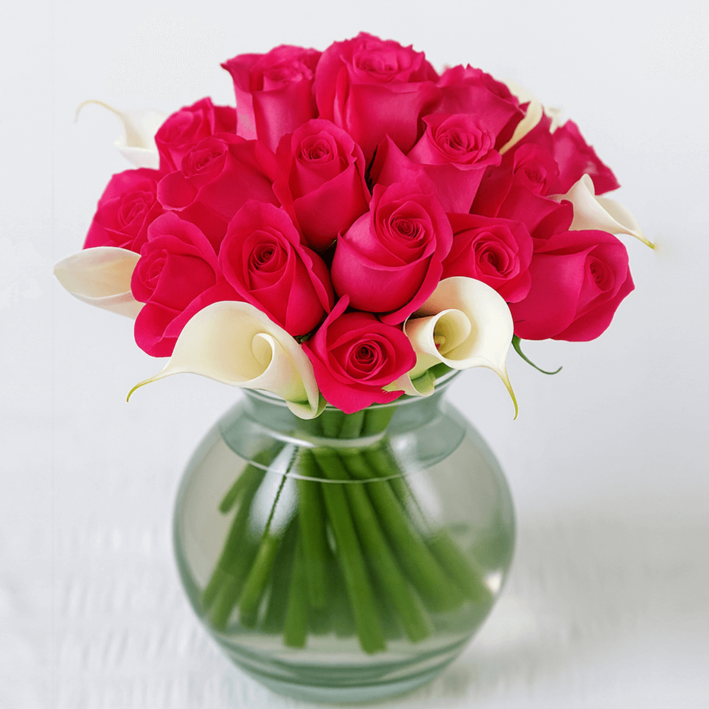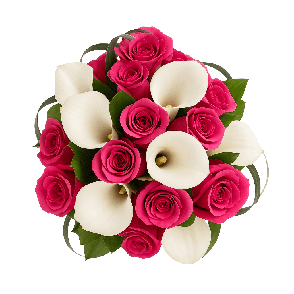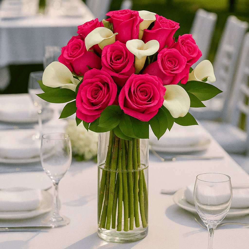 Create a sophisticated atmosphere with our Dark Pink Roses and Calla Lilies Centerpiece — elegant, hand-crafted centerpieces made from farm-fresh flowers.