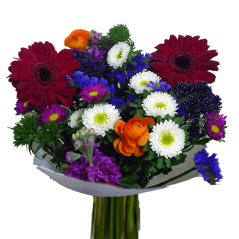 A charming assortment of summery flowers in dazzling colors. Fresh and vase ready, these uplifting blossoms are ideal for anyone and any occasion.