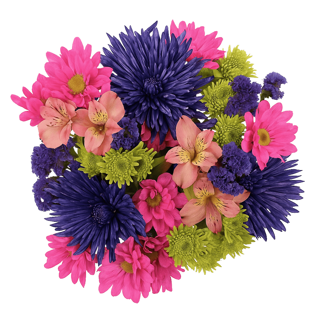 Each bouquet is a captivating arrangement of 13 flowers. Vase not included. Each box comes with 8 beautiful bouquets and each bouquet contains 2 stems of Purple Statice, 3 stems of Dark Pink Alstroemeria, 2 stems of Green Novelty Pompoms, 3 stems of Tinted Blue Spider Mums and 3 stems Tinted Dark Pink Cushion Pompoms.