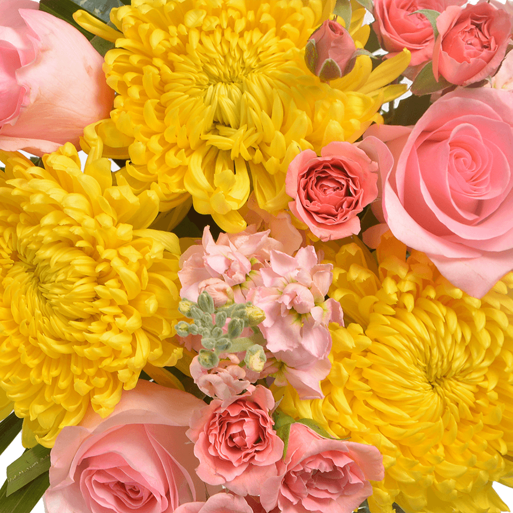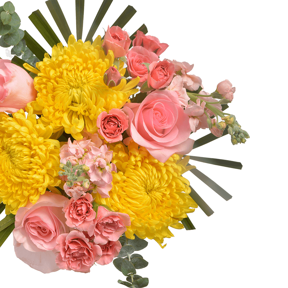 Each bouquet is a gorgeous arrangement of 16 flowers. Vase not included. Each arrangement contains 3 Stems of Pink Roses, 2 Stems of Baby Blue Eucalyptus, 3 Stems of Roebelini Palm, 3 Stems of Peach Stock, 3 Stems of Yellow Mums and 2 Stems of Pink Spray Roses.