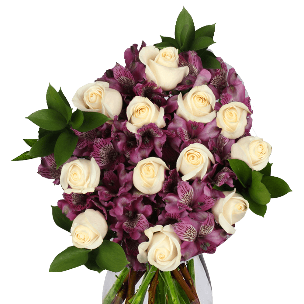Each box contains 1 White and Purple Grandiose Bouquet of 26 Flowers, no vase included. This arrangement contains; 12 stems White Roses, 10 stems of Purple Alstroemerias and 4 stems of Eucalyptus or Ruscus.