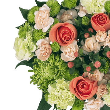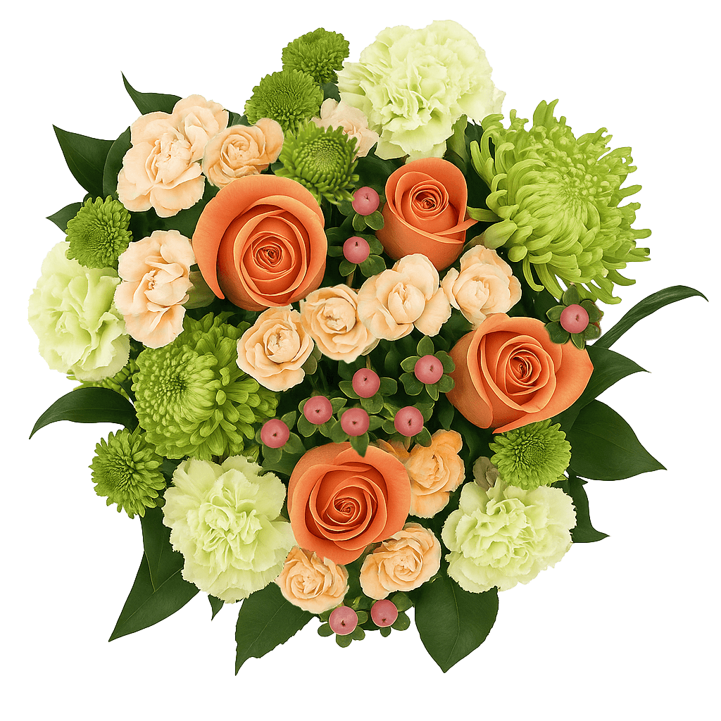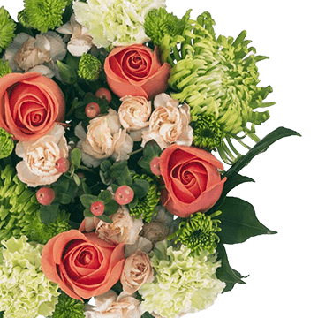 Each bouquet is a marvelous arrangement of 25 flowers. Vase not included. Each box comes with 2 pretty bouquets and each arrangement contains 2 stems of Green Spider Mums, 4 stems of Cocculus, 4 stems of Green Carnations, 2 stems of Pink Hypericum, 4 stems of Orange Rose, 5 stems of Peach Spray Carnations.