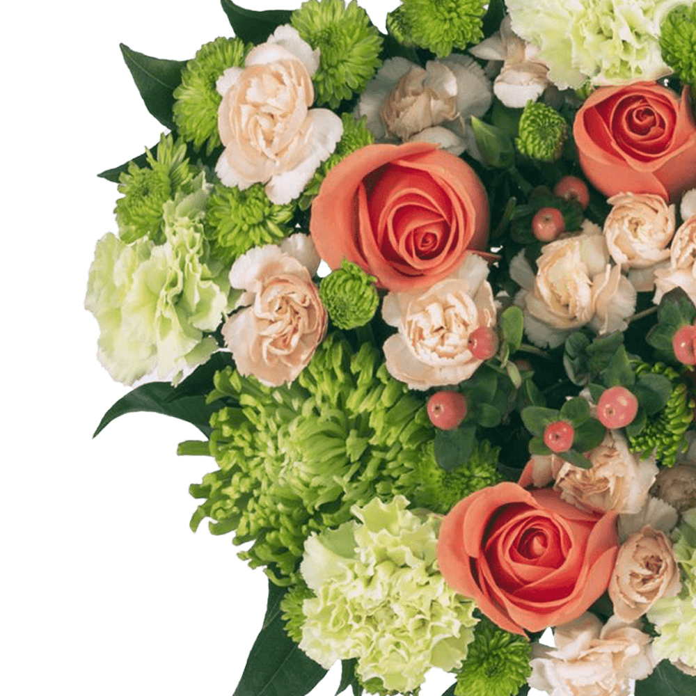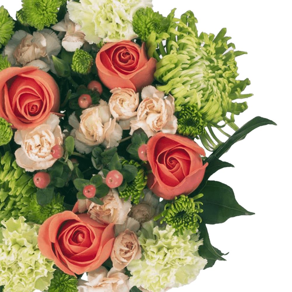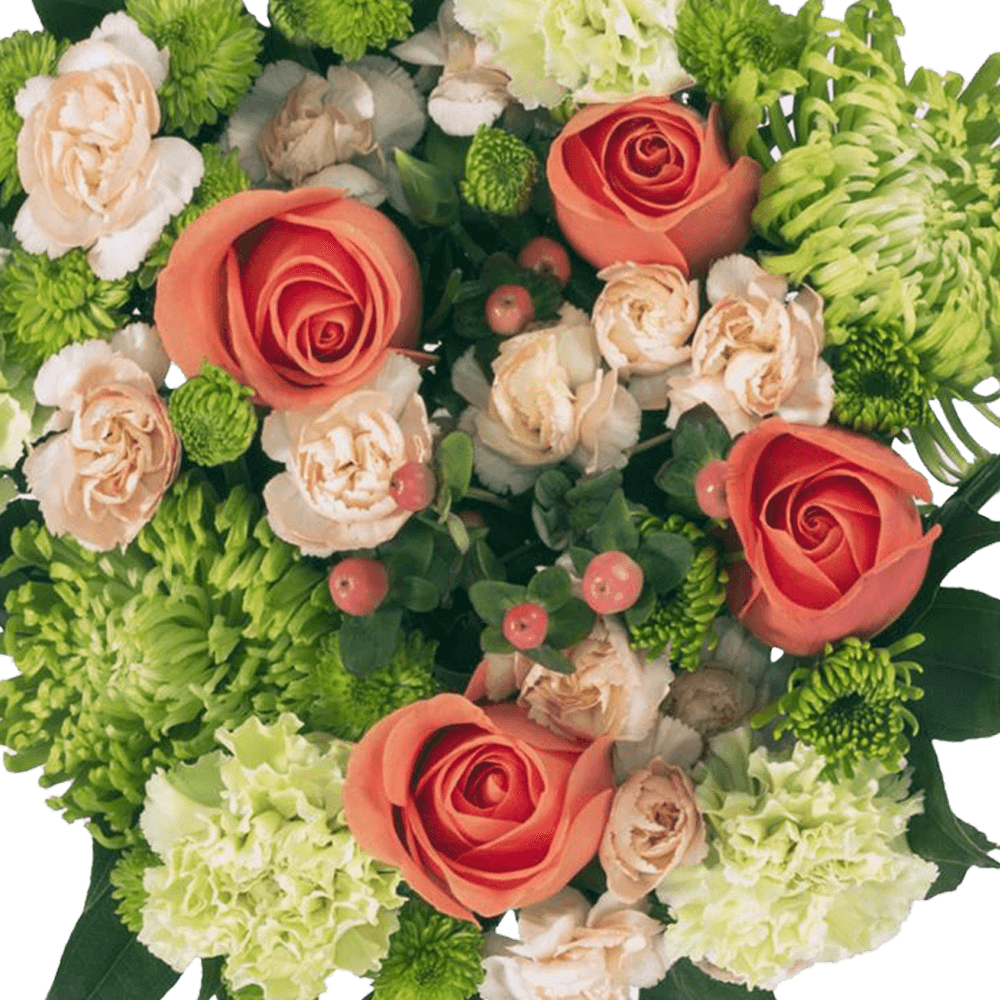 Ice Cream Arrangement is a stunning bouquet of 25 flowers. Each box contains 1 dazzling arrangement no vase included. This has 2 stems of Green Spider Mums, 4 stems of Cocculus, 4 stems of Green Carnations, 2 stems of Pink Hypericum, 4 stems of Orange Rose, 5 stems of Peach Spray Carnations and 4 stems of Zembla Cushion Pompoms.