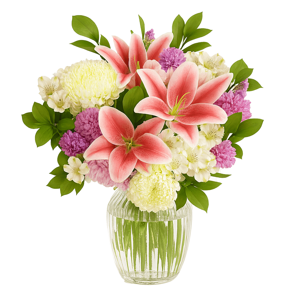 Each bouquet is a magnificent arrangement of 25 flowers. Vase not included. Each box comes with 5 stunning bouquets and each arrangement contains; 1 Pink Oriental Lily, 2 stems of White Football Mums, 6 stems of White Alstroemerias, 3 stems of Liatris, 8 stem of Ruscus and 5 stems of Lavender Cushion Poms.