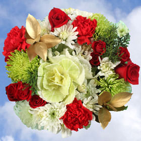 Each bouquet is a dreamy arrangement of 18 flowers. Vase not included. Each box comes with 2 bouquets and each arrangement contains; 3 stems of Red Carnations, 1 stem of Green Pine, 2 stems of Tinted Gold Ruscus, 1 stem of Kale, 3 stems of Green Spider Mums, 3 stems of White Cushion Poms, 3 stems of Red Roses and 2 stems of Red Spray Roses.
