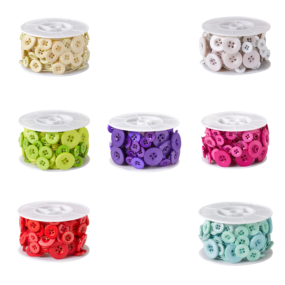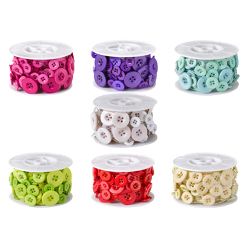 Three sizes of buttons (1/2" D, 5/8" D, 7/8" D) strung 2" apart on color coordinating wire. Ready-made accessory provides an intricate detail in seconds Each spool contains three sizes and three hues of buttons for a rich collected look 18 Ft. per roll, 6 rolls per case.