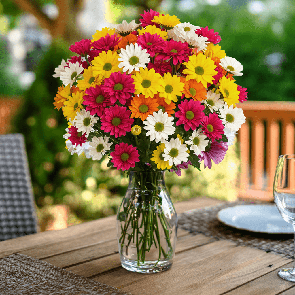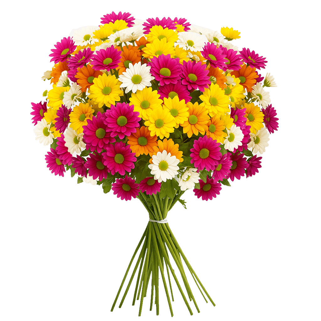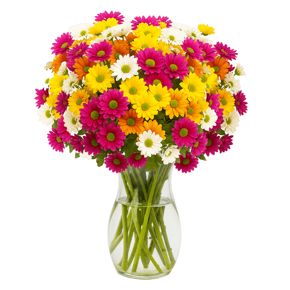 Add a soft, cheerful touch with Assorted Daisy Poms. Choose your desired of stem count, these wholesale flowers are shipped fresh and ready for gifts, weddings or special events.