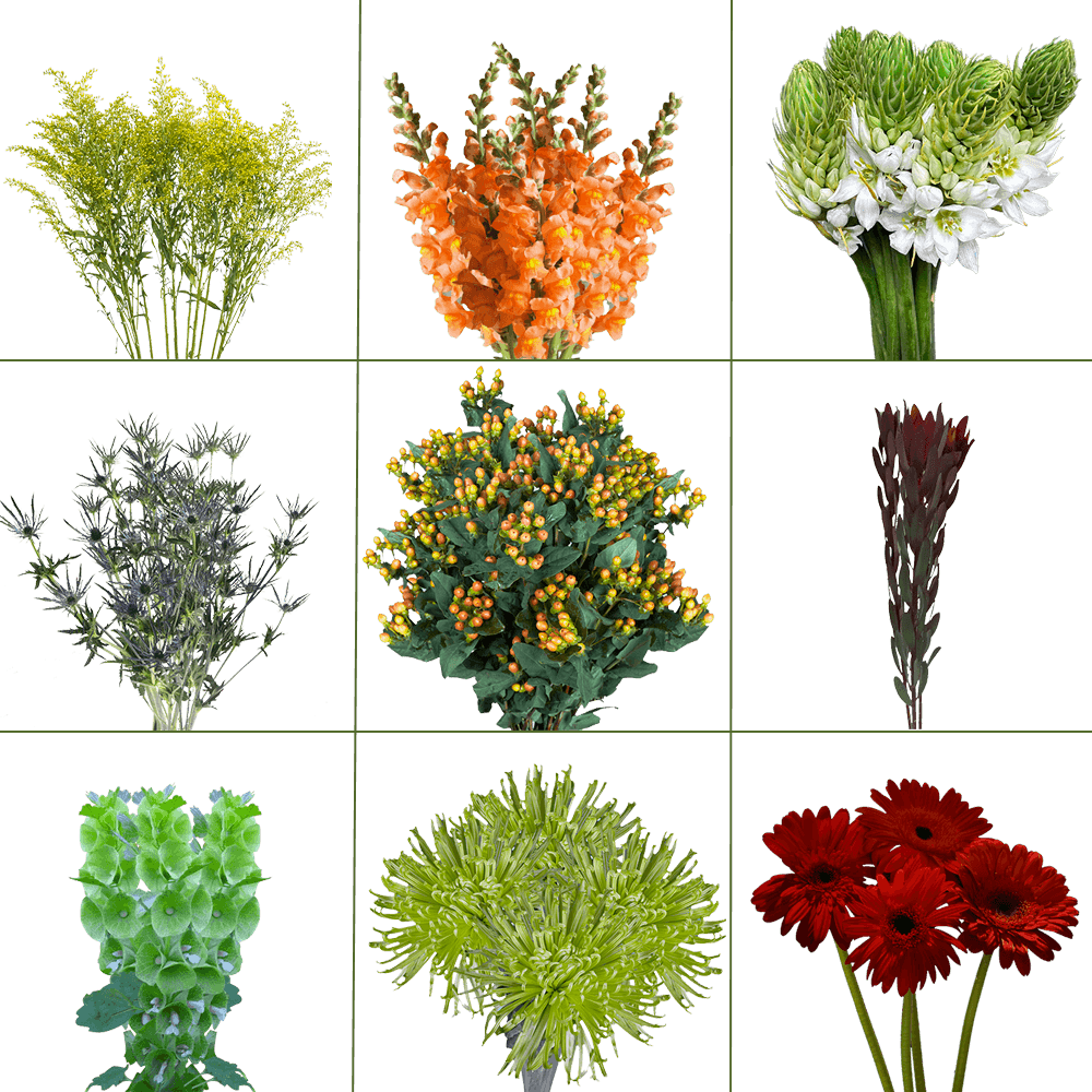 This combo box is perfect for a flower bar or parties, featuring 20 bunches, totaling up to 200 stems of specialty flowers including Gypsophila (Baby's Breath), Gerbera, Alstroemerias, Leucadendron, Limonium, Solidago, Star of Bethlehem, Statice, Spiders, Snapdragon, Bells of Ireland, Sunflowers, Kangaroo, Hypericum, and Eryngium.