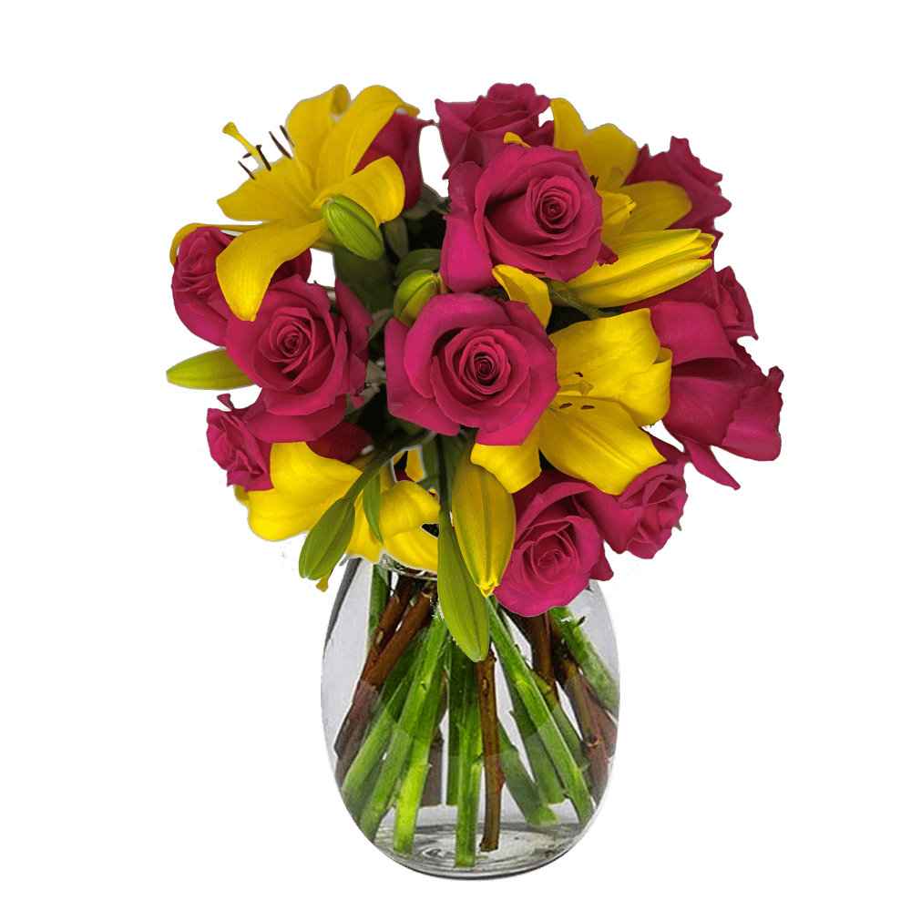 Hot Pink and Yellow Spectacular Bouquet is an exquisite arrangement of 17 flowers. Each box comes with 2 enchanting bouquets, no vase included. Each bouquet has 12 stems of Hot Pink Roses, and 5 Yellow Asiatic Lilies.