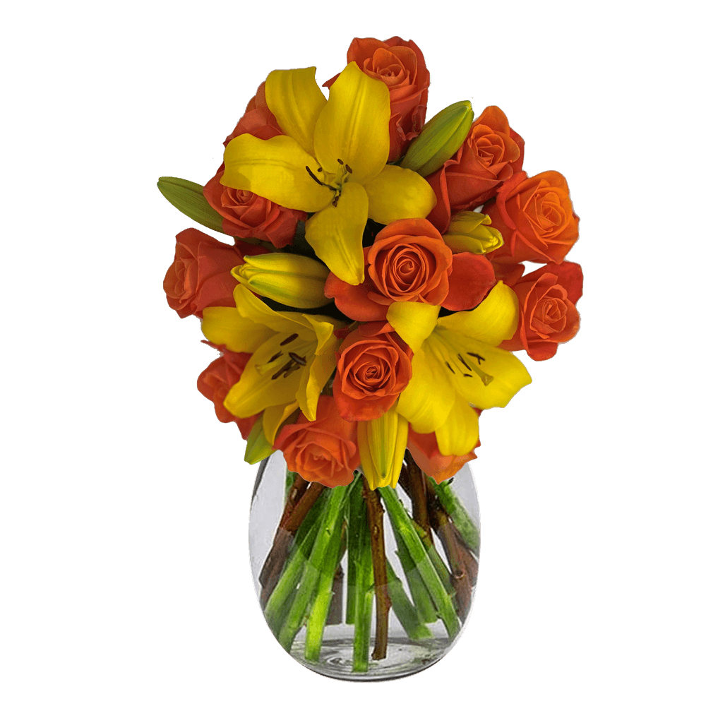 Orange and Yellow Spectacular Bouquet is a captivating arrangement of 17 flowers. Each box comes with 1 pleasing bouquet, no vase included. This bouquet has 12 stems of Orange Roses and 5 Yellow Asiatic Lilies.