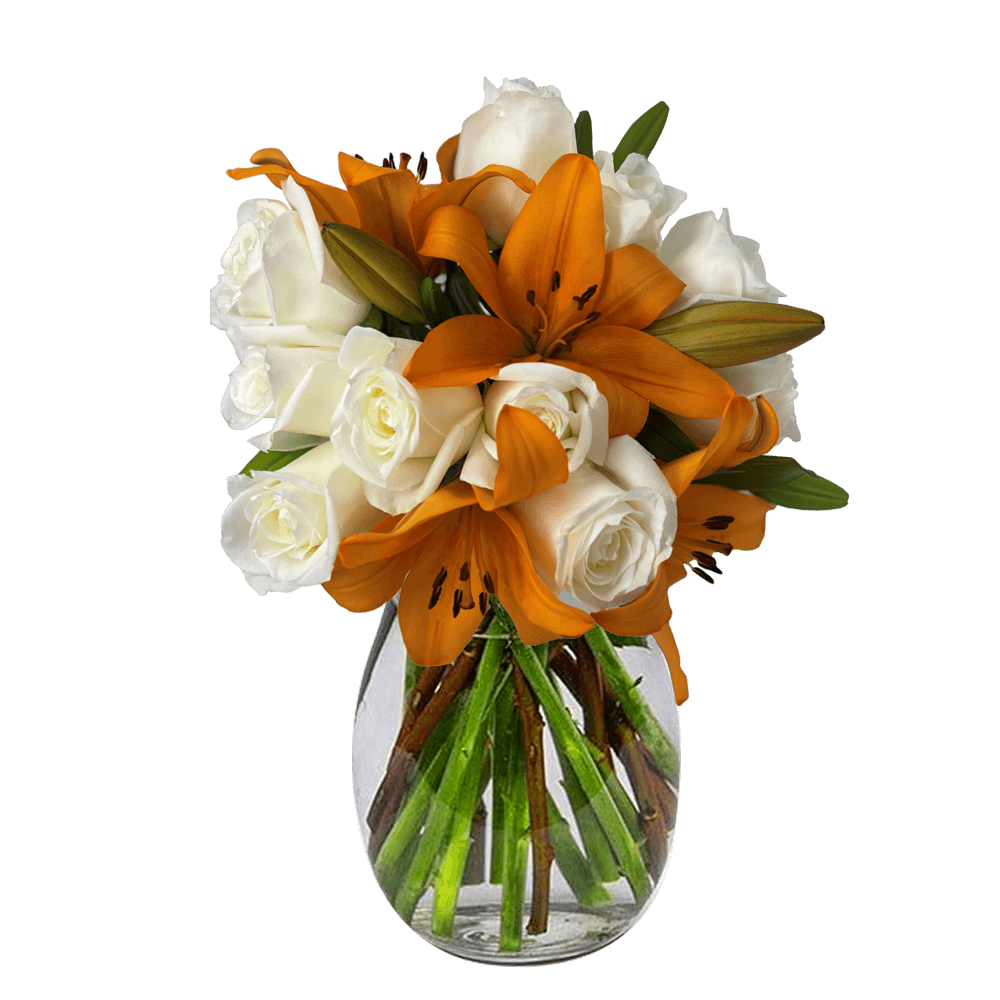 White and Orange Spectacular Bouquet is a captivating arrangement of 17 flowers. Each box comes with 1 pleasing bouquet, no vase included. This bouquet has 12 stems of White Roses and 5 Orange Asiatic Lilies.