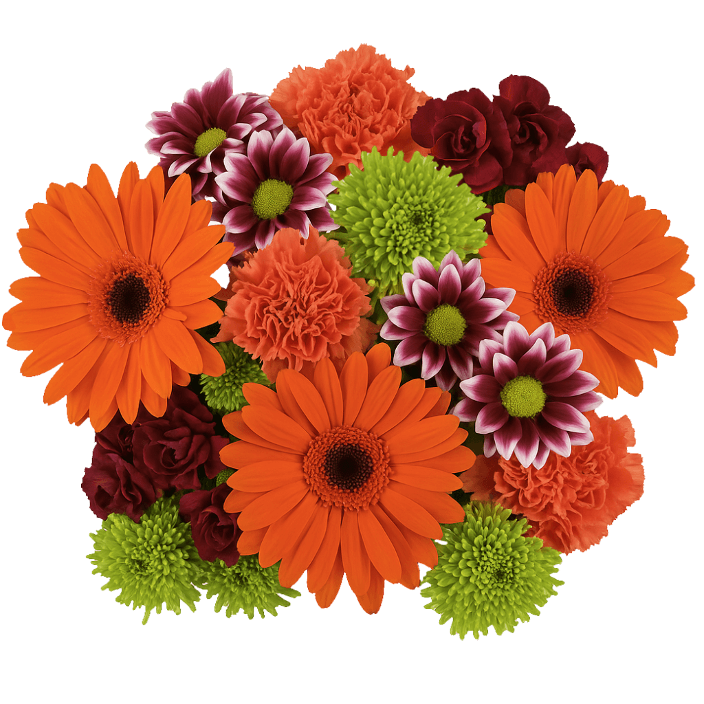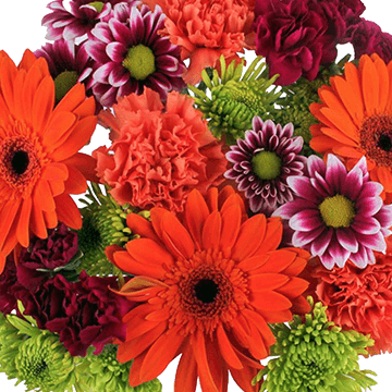 Each bouquet is a captivating arrangement of 13 flowers. Vase not included. Each box comes with 2 beautiful bouquets and each arrangement contains 3 stems of Orange Gerbera, 3 stems of Green Novelty Pompoms, 3 stems of Orange Carnations, 2 stems of Orange Spray Carnations, 2 stems of Purple Orinoco Pompons