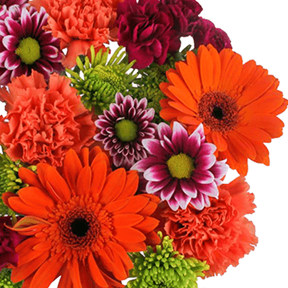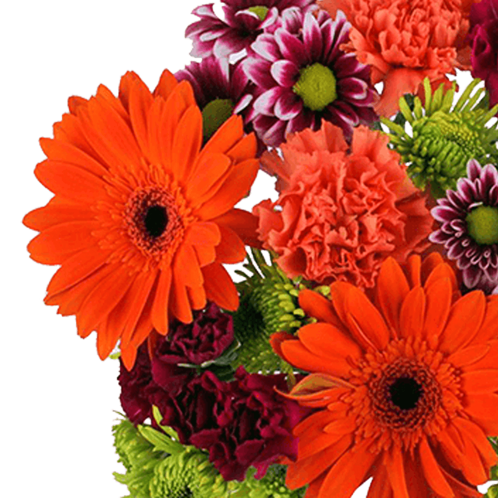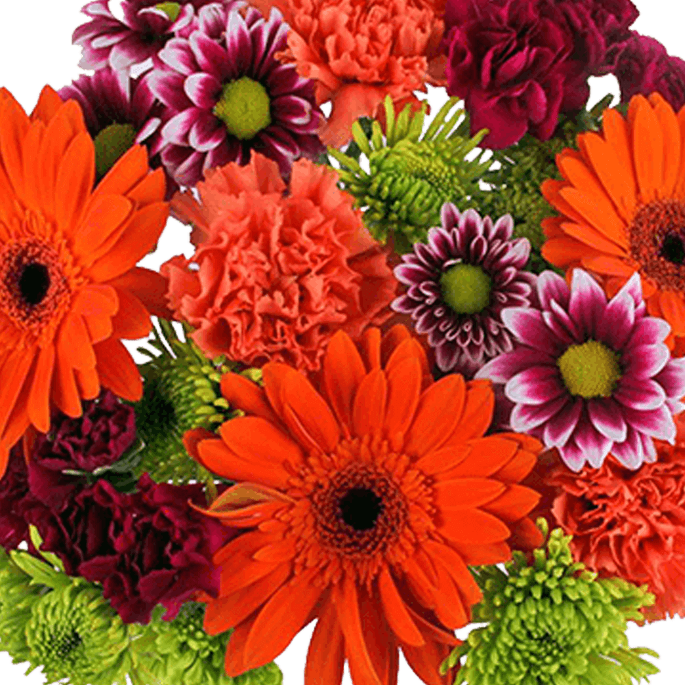 Sunny Days is an alluring bouquet of 13 flowers. Each box comes with 1 marvelous arrangement no vase included. This bouquet has 3 stems of Orange Gerbera, 3 stems of Green Novelty Pompoms, 3 stems of Orange Carnations, 2 stems of Purple Spray Carnations, 2 stems of Purple Orinoco Pompons.