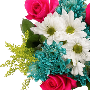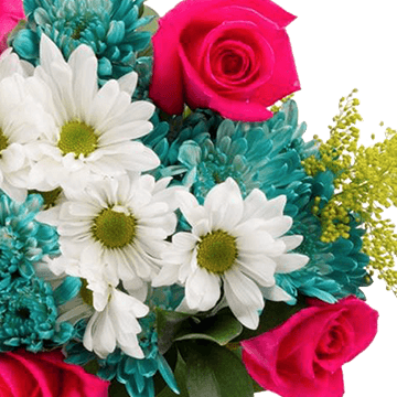 Sweet Watermelon is a stylish bouquet of 14 flowers. Each box comes with 1 astonishing arrangement no vase included. This bouquet includes 4 stems of Dark Pink Roses, 2 Stems of White Daisies Pompoms, 3 stems of Ruscus, 3 stems of Aquamarine Tinted Pompoms and 3 stems of Solidago.