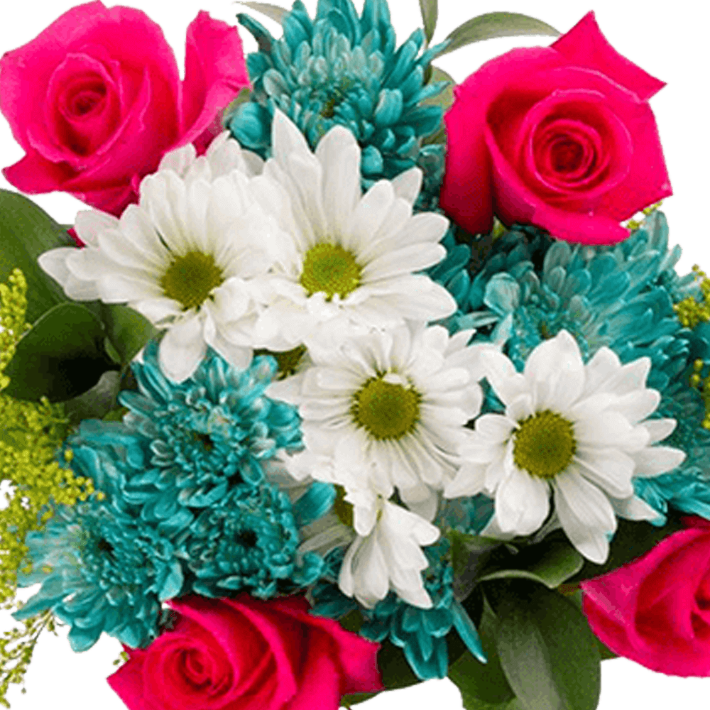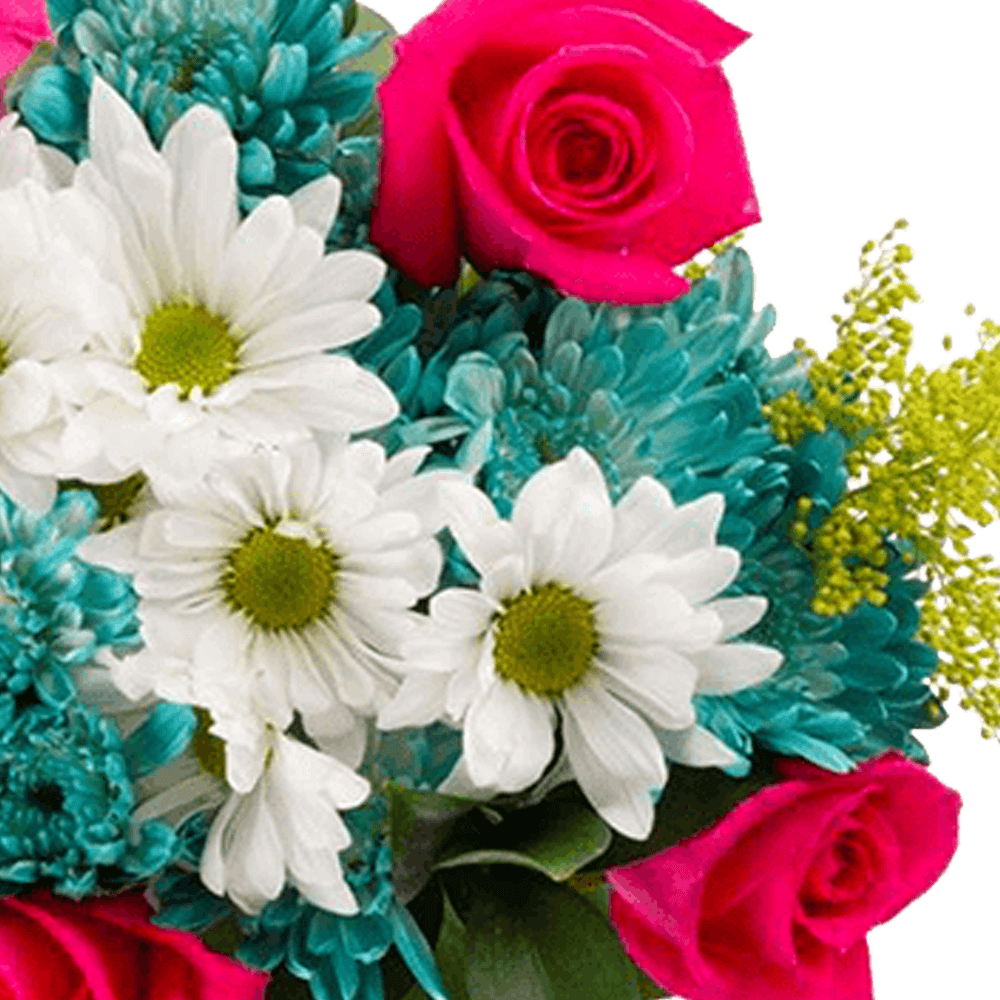 Sweet Watermelon is a stylish bouquet of 14 flowers. Each box comes with 1 astonishing arrangement no vase included. This bouquet includes 4 stems of Dark Pink Roses, 2 Stems of White Daisies Pompoms, 3 stems of Ruscus, 3 stems of Aquamarine Tinted Pompoms and 3 stems of Solidago.