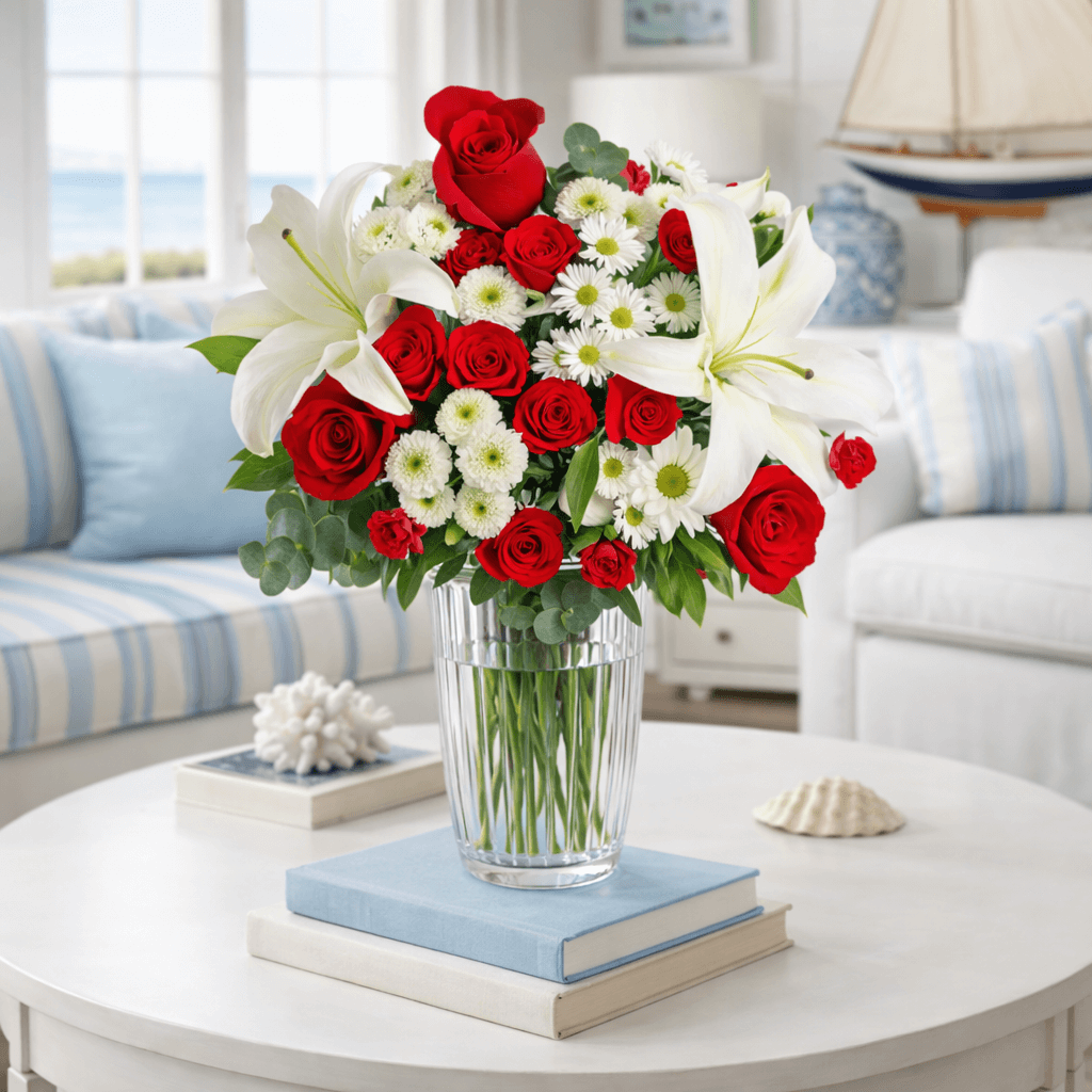 Each bouquet is a spectacular arrangement of 18 flowers. Vase not included. Each arrangement contains; 2 stems of Eucalyptus, 3 stems of Red Roses, 3 stems of Red Spray Roses, 2 stems of White Alstroemerias, 3 stems of Red Mini-Carnations, 1 stem of White Aster, 1 stem of White Daisy Poms, 2 stems of White Button Poms, and 1 stem of White Oriental Lily.