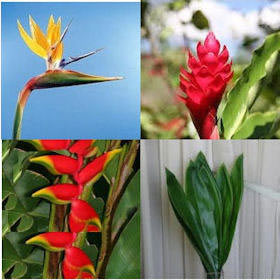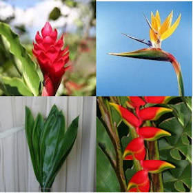 This Beautiful Tropical Combo Pack brings an exotic flair to your floral gift or decor. Approximately 15 stems red ginger, 15 stems birds of paradise, 15 stems fire opal, 15 stems of leaves.