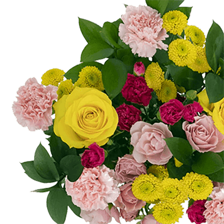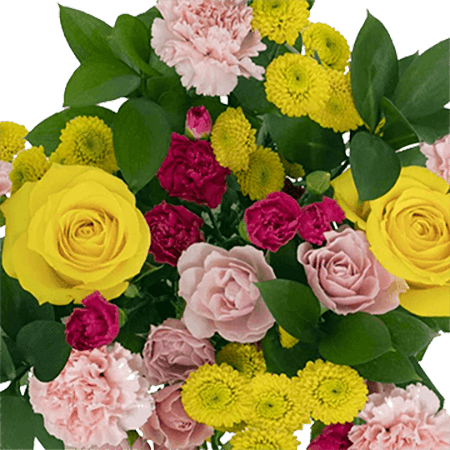 Umbrella is an extraordinary arrangement of 20 flowers. Each box comes with 1 remarkable bouquet no vase included. This bouquet contains 5 stems of Pink Carnations, 5 stems of Ruscus, 3 stems of Yellow Button Pompoms, 2 stems of Pink Spray Carnations, 2 stems of Yellow Roses, 3 stems of Dark Pink Carnations.