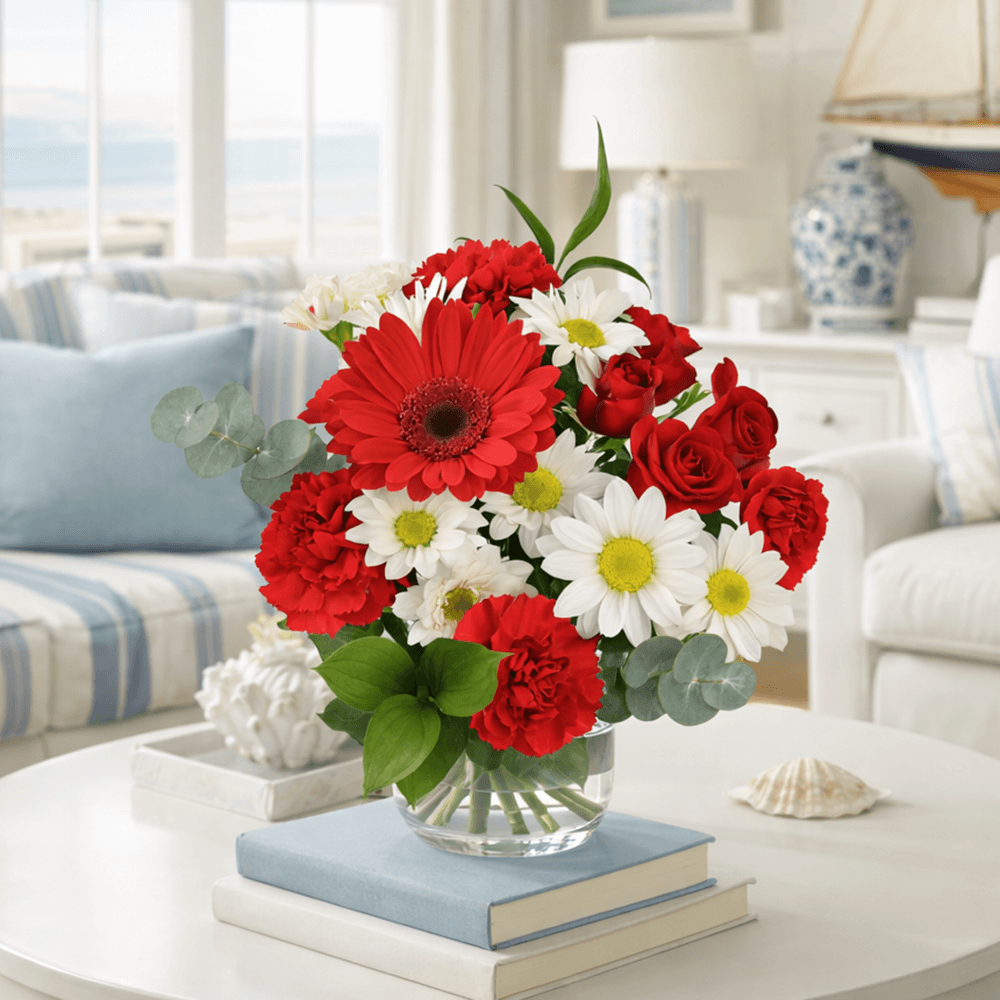 All 10 stylish arrangements contains 15 stems each. Within every bouquet, you will find 1 stem of white Alstroemeria, 3 stems of red Carnations, 1 red Gerbera Daisy, 2 stems of Eucalyptus, 2 stems of Ruscus, 2 stems of red Mini-Carnations, 1 stem of white Cushion Pom, 2 stems of white Daisy Poms and 1 stem of red Spray Rose. Vase not included.