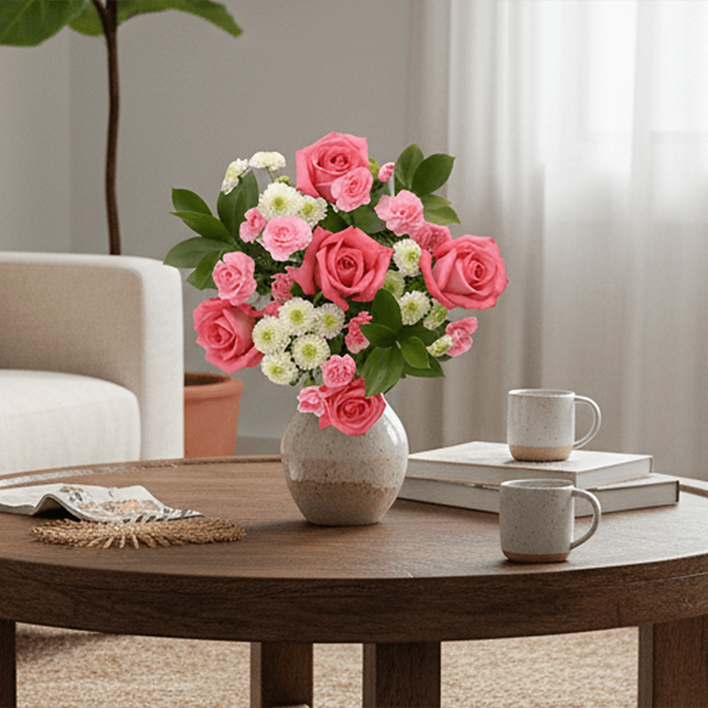 Fall in love with the lovely pink and white petals displayed by our garden-fresh roses, mini carnations, button Pompoms as well as the greenery from our oval ruscus leaves. These rich and regal blooms will make the perfect gift to show your love and appreciation to your mom, partner, relatives, colleagues or even your closest neighbors. If you're hosting a grand event such as weddings or anniversary celebrations, these Valentines Day, bulk honey arrangements, will set the stage for a day of everlasting love.
