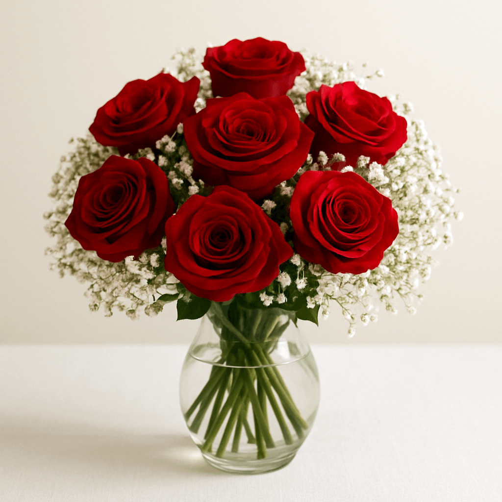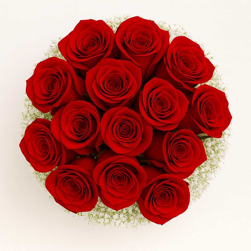 Each centerpiece is a chic arrangement of 26 flowers. Vase not included. Each box comes with 12 stylish centerpieces and each arrangement contains; 16 stems of Red Roses and 10 stems of Baby's Breath.