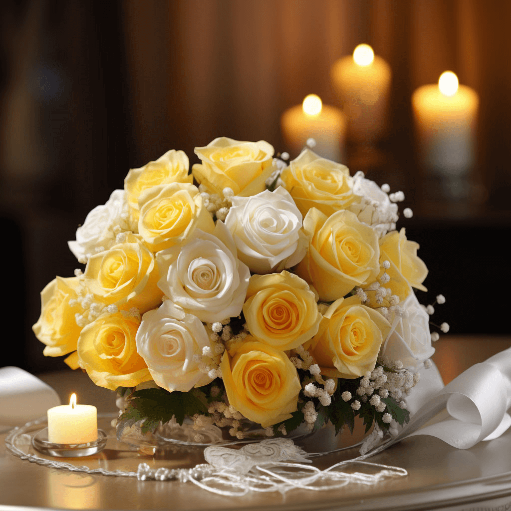 Each centerpiece is a vivid arrangement of 26 flowers. Vase not included. Each box comes with 6 blissful centerpieces and each arrangement contains; 16 stems of White and Yellow Roses and 10 stems of Baby's Breath.