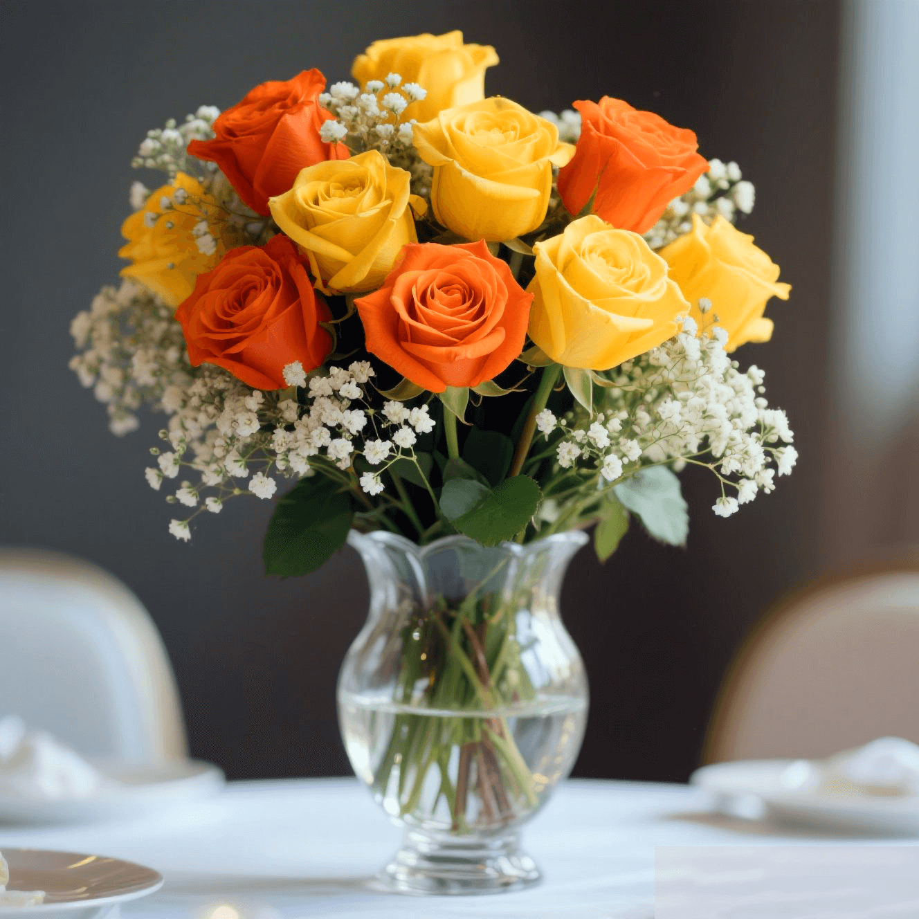 Each centerpiece is a gorgeous arrangement of 26 flowers. Vase not included. Each box comes with 3 beautiful centerpieces and each arrangement contains; 16 stems of Yellow and Orange Roses and 10 stems of Baby's Breath.
