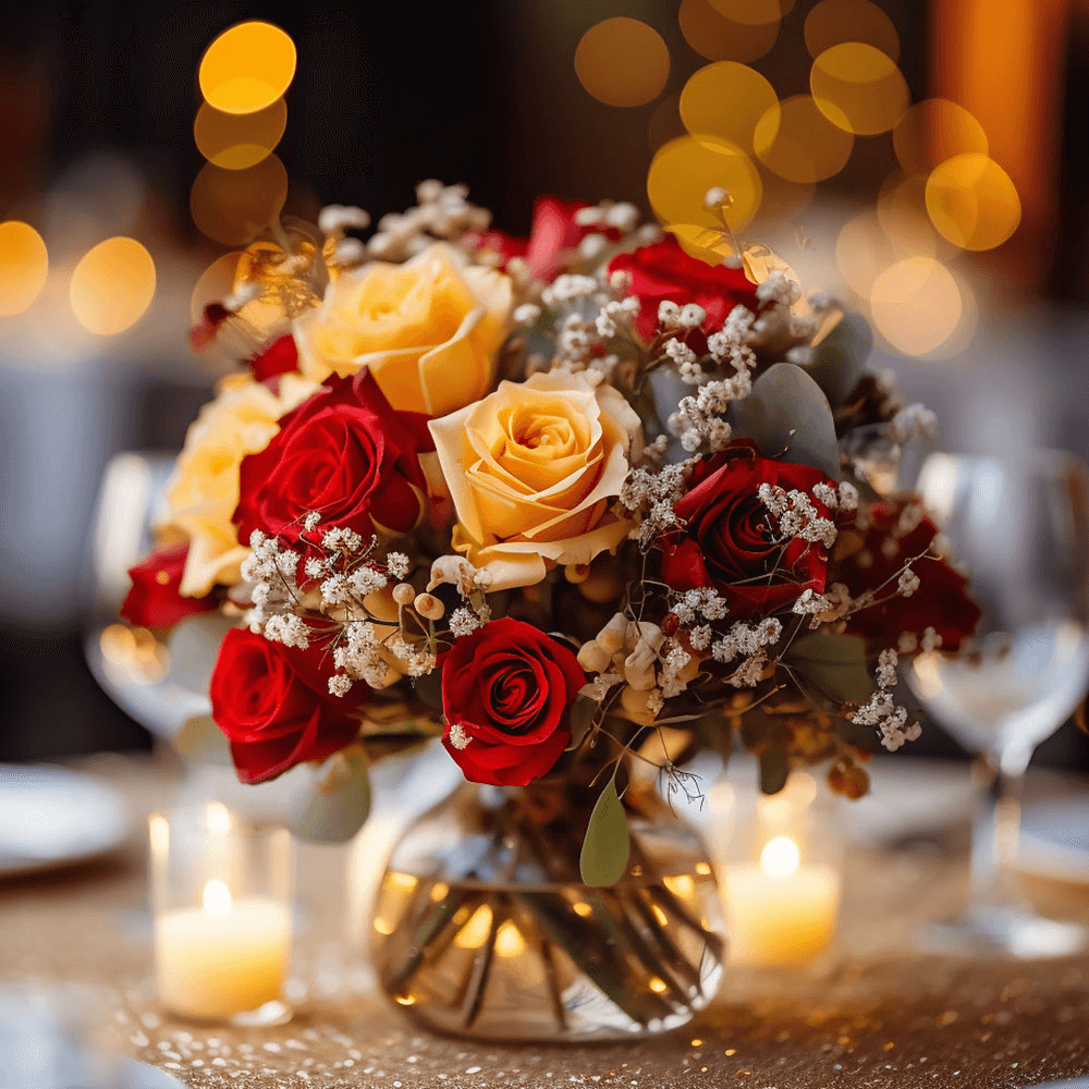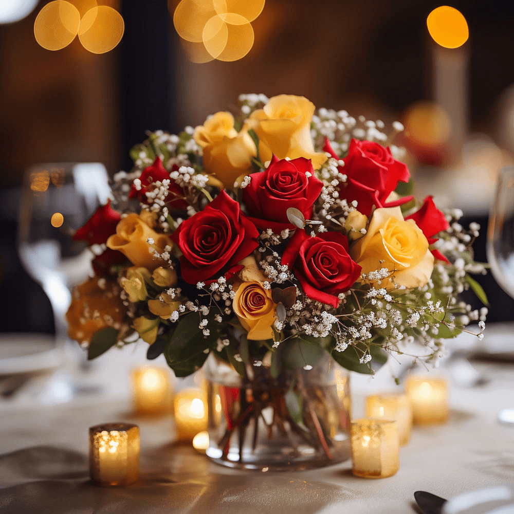 Each centerpiece is a wondrous arrangement of 26 flowers. Vase not included. Each box comes with 6 delightful centerpieces and each arrangement contains; 16 stems of Yellow and Red Roses and 10 stems of Baby's Breath.