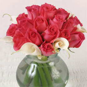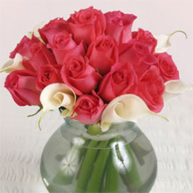 Each centerpiece is a splendid arrangement of 28 flowers. Vase not included. Each box comes with 3 fabulous centerpieces and each arrangement contains; 21 stems of Dark Pink roses and 7 stems of White Calla Lilies.