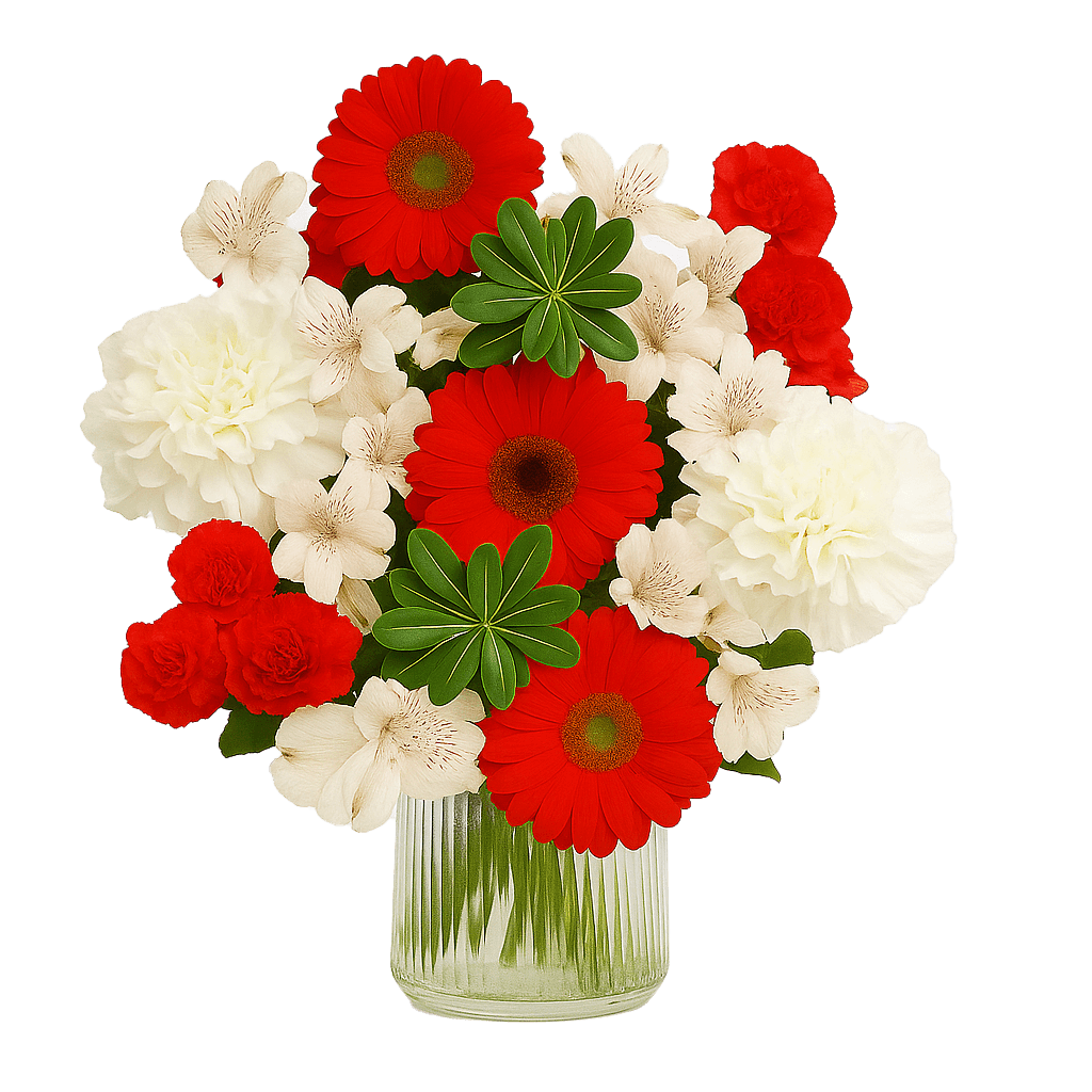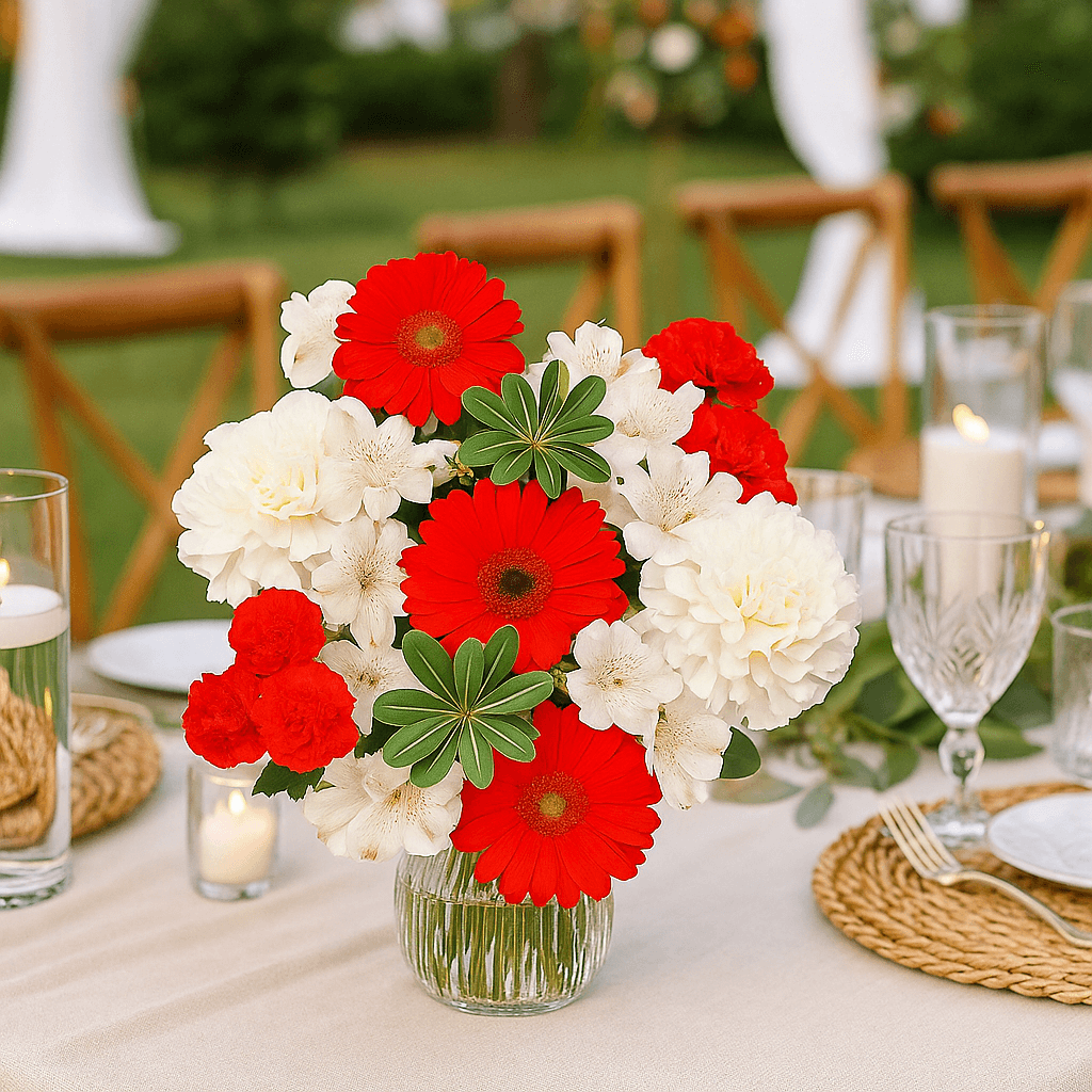 A simple beauty of elegance in these centerpieces, each box contains 12 Grand and Graceful arrangements (each arrangement contains 2 stems of mini-carnation red, 2 stems of pittosporum green, 3 stems of gerbera red, 3 stems of alstroemeria white and 2 stems of carnation white), No vase included. Your wedding flowers and wedding roses are shipped absolutely fresh, direct from the greenhouses to you via FedEx. Globalrose sells wholesale flowers and wholesale roses at prices that are usually lower than most local wholesalers. Flowers are cut specially for you 3 days before they are delivered to your door. Color tones for all flowers and roses may vary due to the computer monitor and/or Mother Nature.