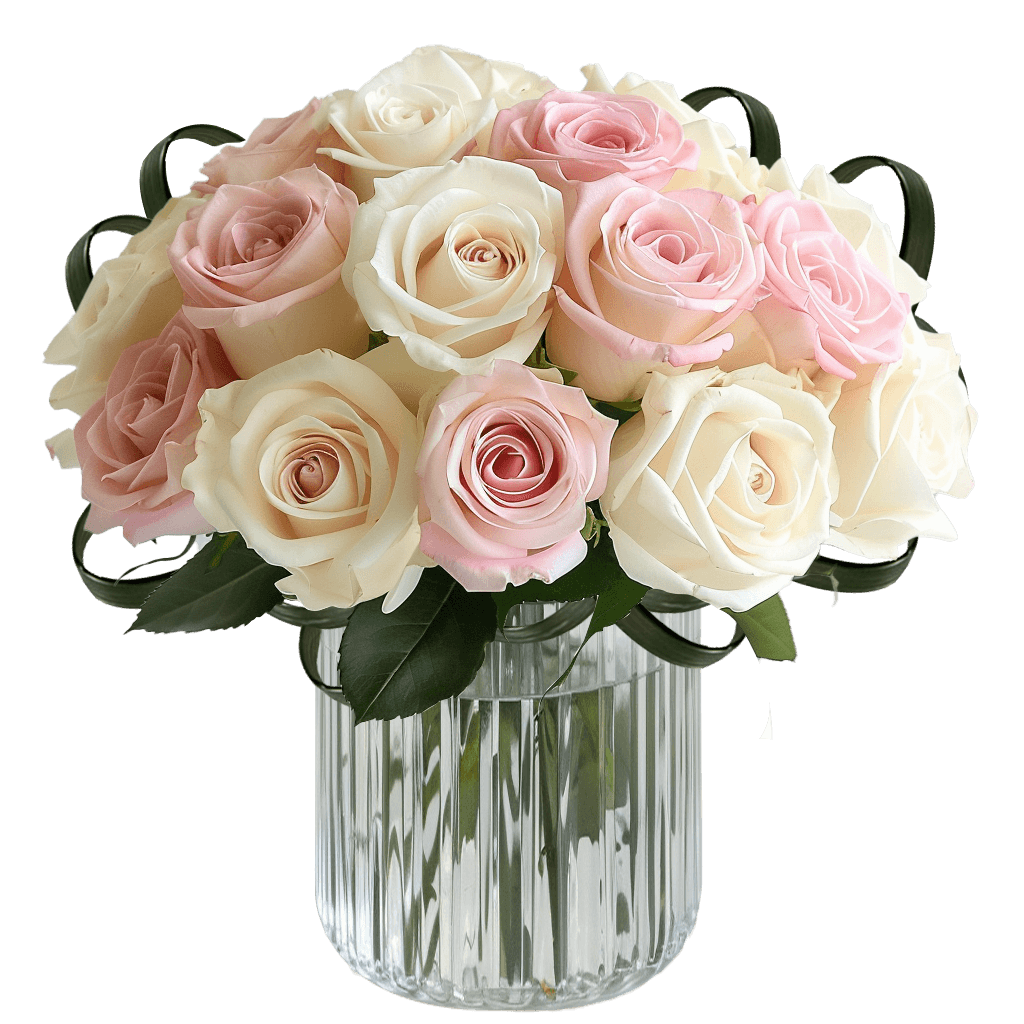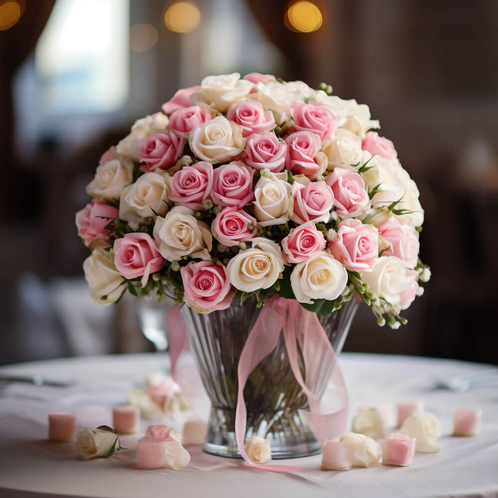 Create a magical wedding atmosphere with our exquisite centerpieces featuring lush light pink roses blended with creamy ivory petals, all meticulously arranged to captivate your guests. Experience romance in bloom with premium roses next-day delivered fresh to your event.
